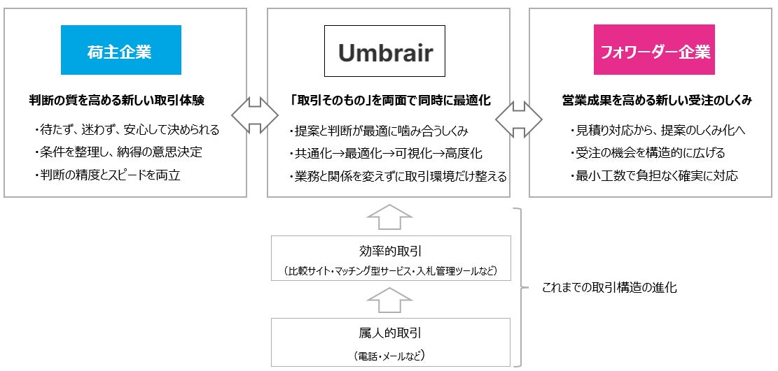 MASTが提供する「Umbrair(アンブレア)」は、荷主とフォワーダーが同じ情報をもとにスムーズかつ正確に取引できる環境を整える中立型の共通取引プラットフォームです。それぞれの意思と判断を正しく噛み合わせることで、手間を減らし、より迅速で確実な取引を可能にします。