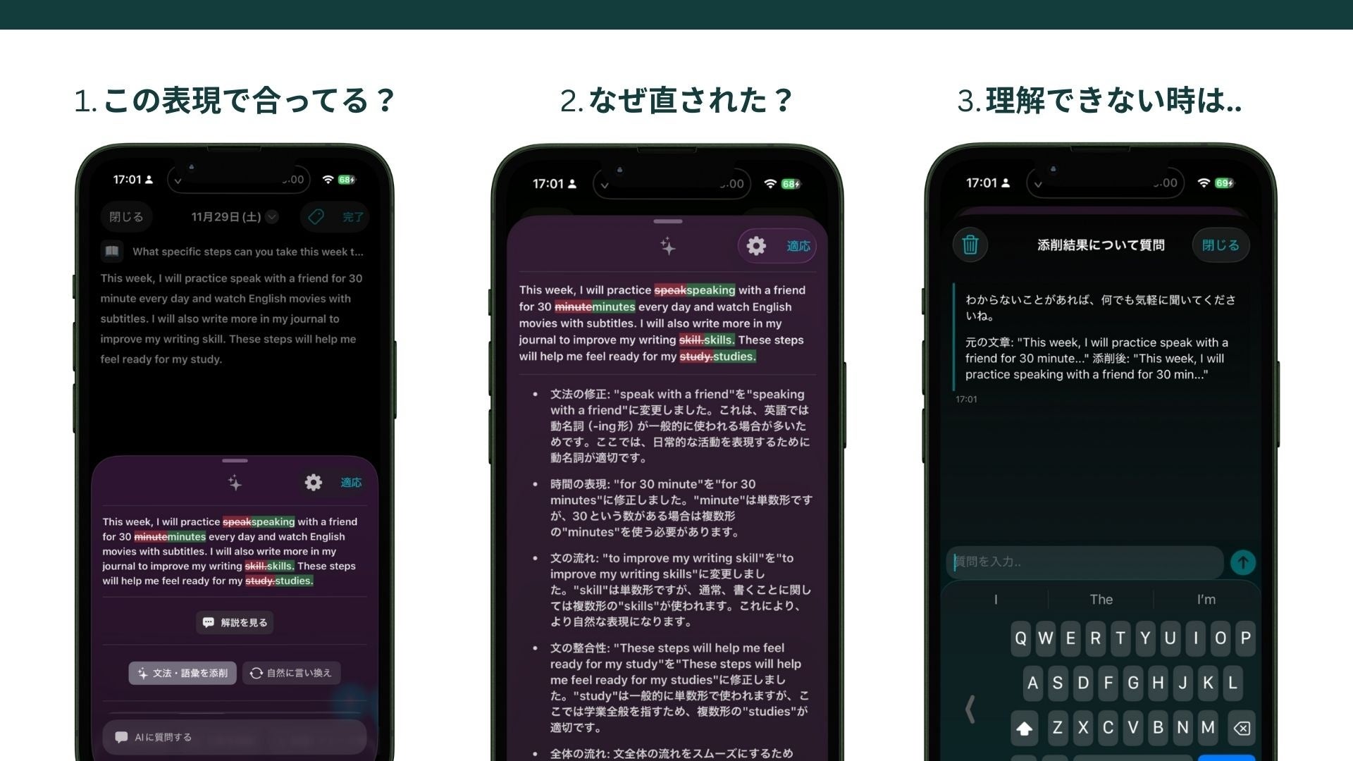 “日常の出来事を英語で書き、AIが自然な英語へ導く” という全く新しい学習体験を提供し、