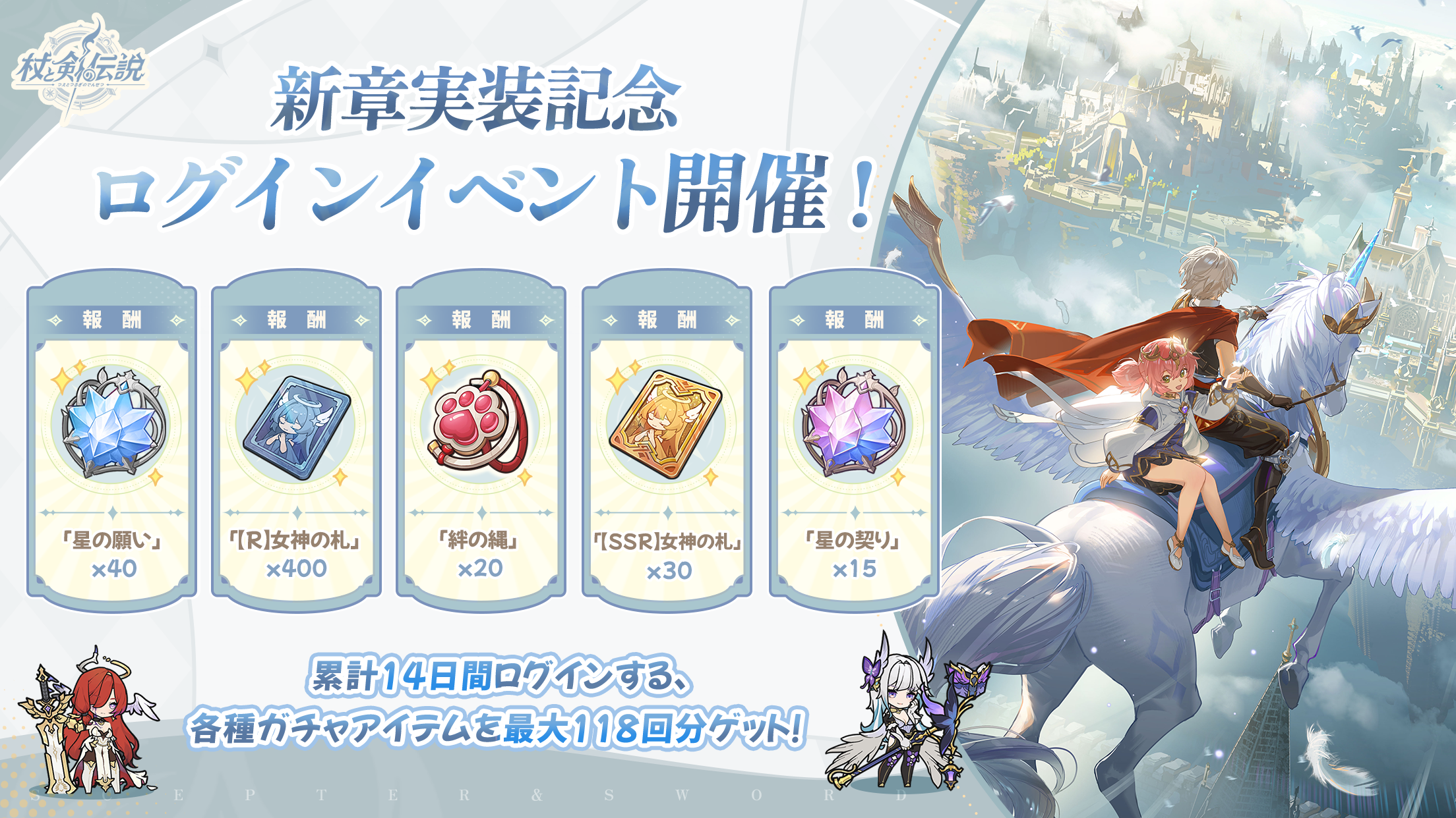 新章「羽の国」を記念し、特別ログインイベントの開催が決定!累計14日間ログインするだけで、各種ガチャに使えるアイテムを最大でなんと118回分ゲット!この機会に、幻獣や強力なスキルを手に入れよう。羽の国の幕開けとともに、あなたの旅路に追い風を――。