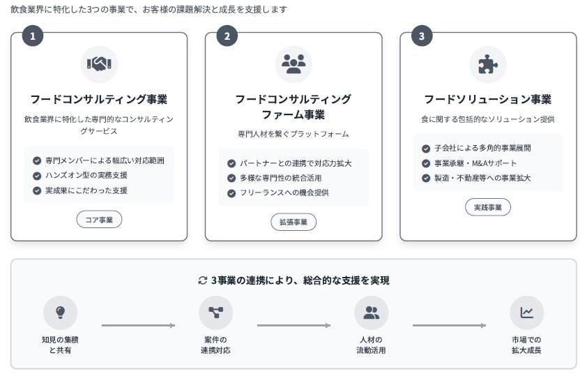 コンサルティング×専門人材×事業承継を3本柱に、飲食業界の課題をあらゆる角度から分析し、 これまでの常識を覆す構想や仕組み、関わりを持って実行・改善・成長まで実務を含めた一貫支援を行います!