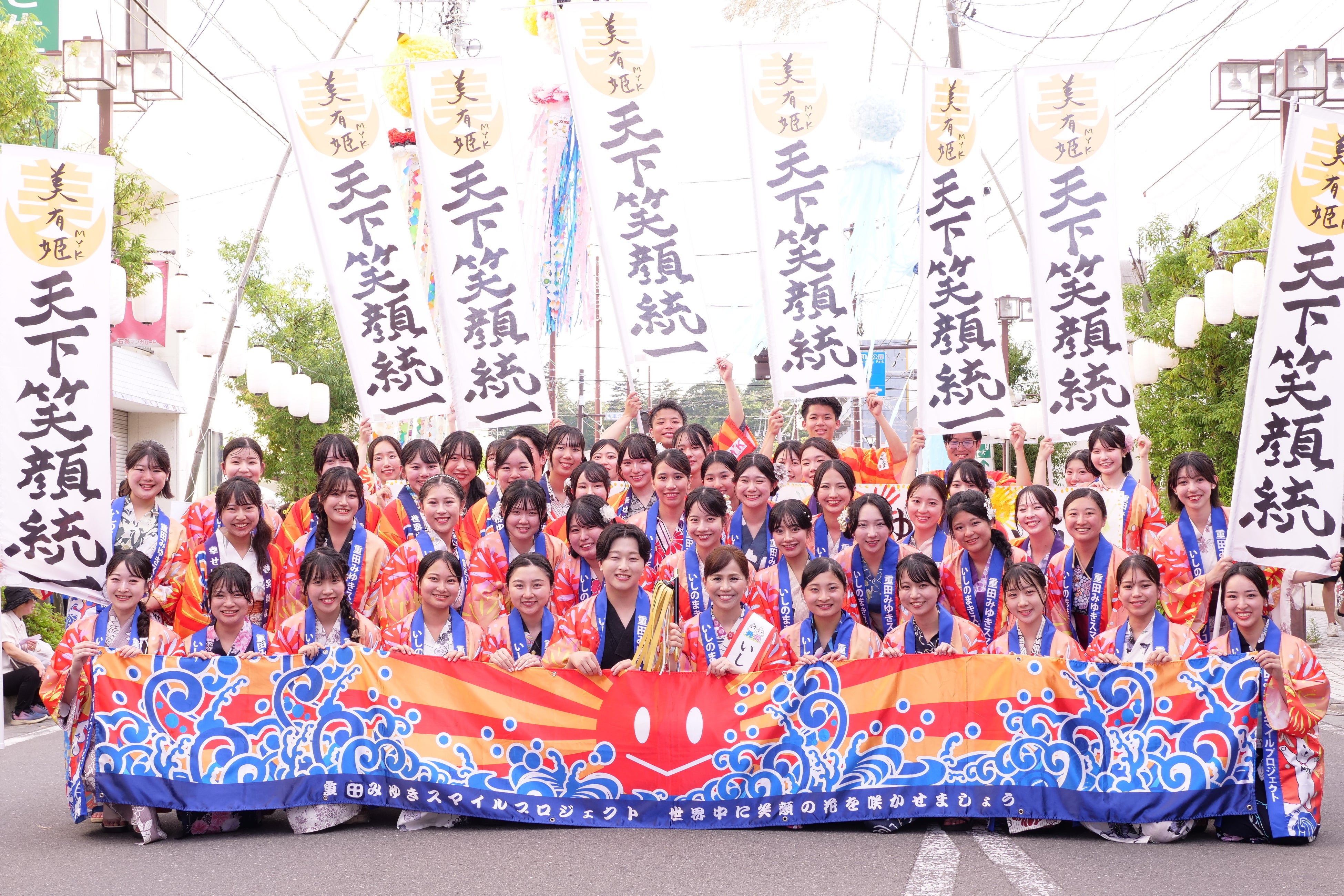 石巻市民へ元気になる笑顔の作り方をレクチャー、街の笑顔清掃活動、ライブイベントのシーンも。