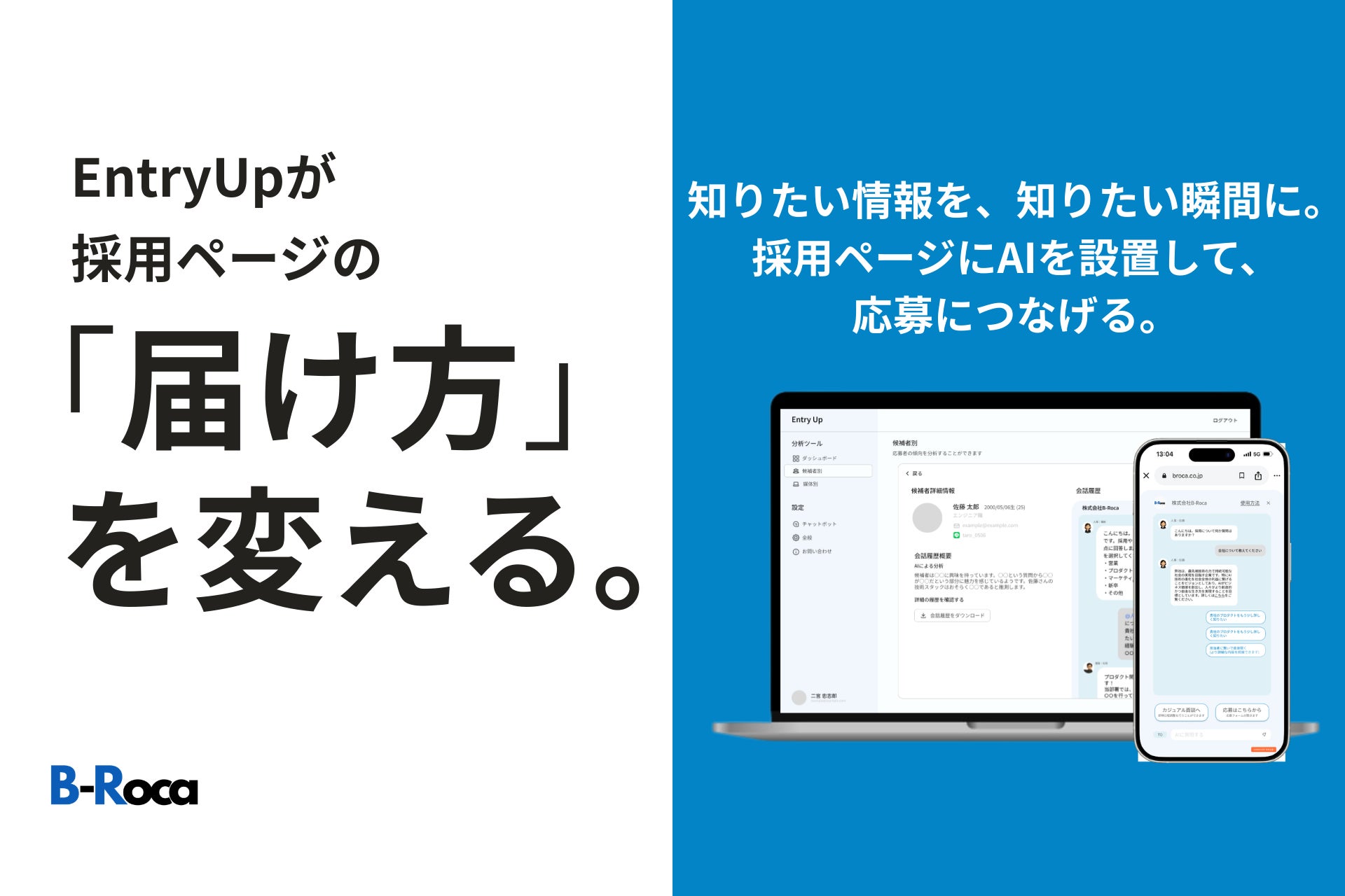 株式会社B-Roca(本社:東京都文京区、代表取締役:二宮忠志郎、以下 B-Roca)は、企業の採用ページにAI対話機能を実装する採用支援AIチャットボット「EntryUp(エントリーアップ)」を提供しています。