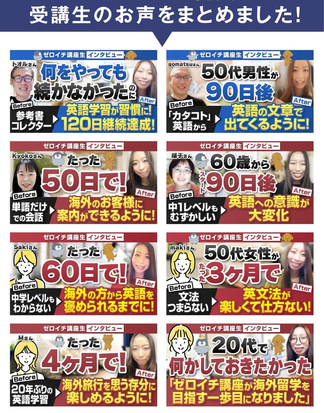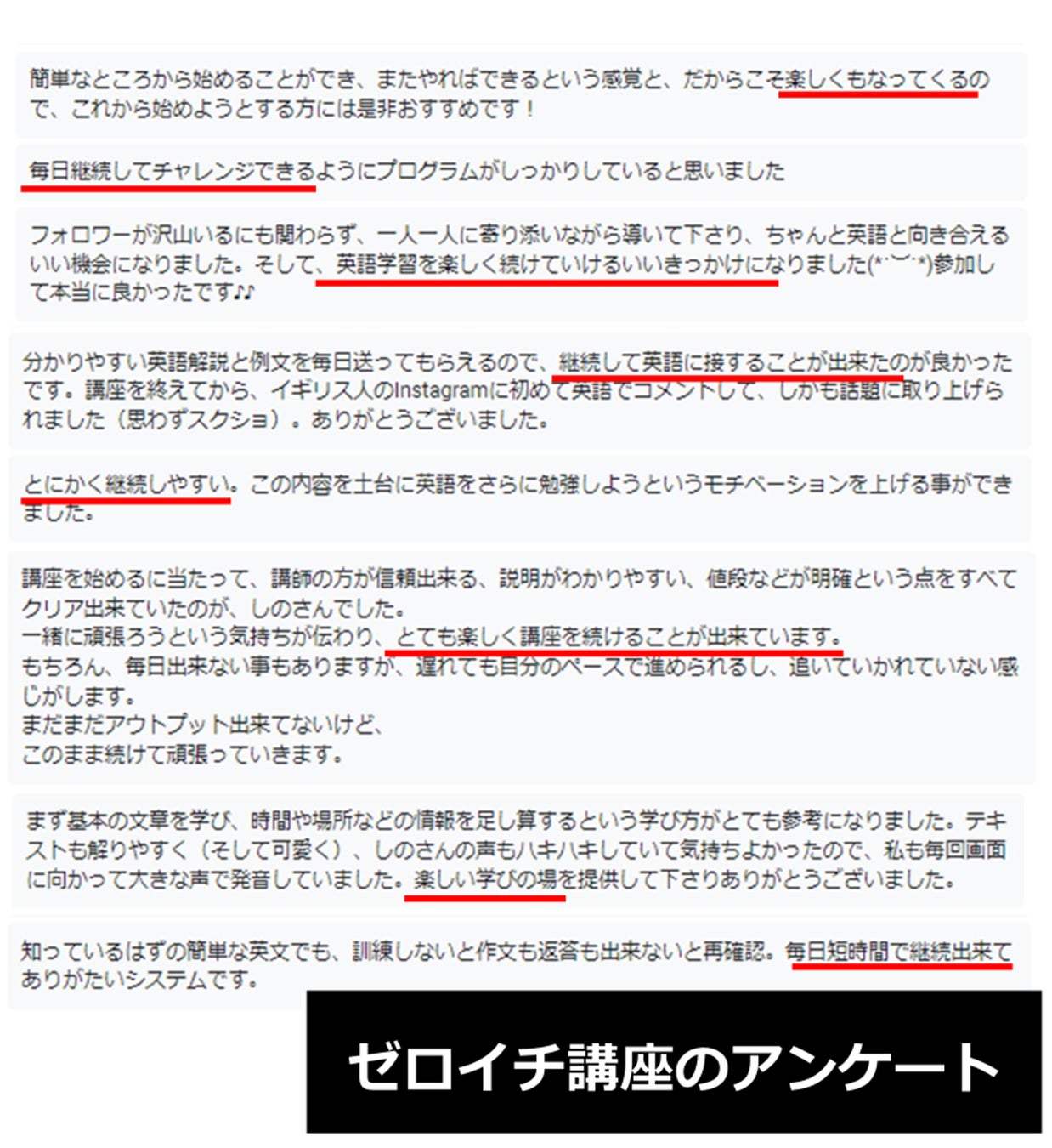 実際に(Yumikoさんだけでなく)ゼロイチ講座を受講した方からは、「英語が出てくるようになった」というお声だけにとどまらず、多くの方が「英語学習が楽しみになった」「英語が話せたり、学習が継続できることが自信につながった」とポジティブな変化を実感しています。(SNSでのお声やアンケート調査結果による。)