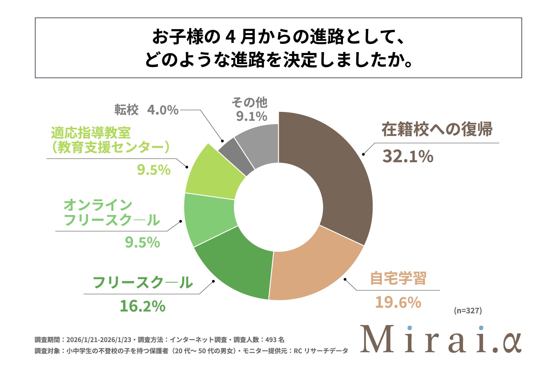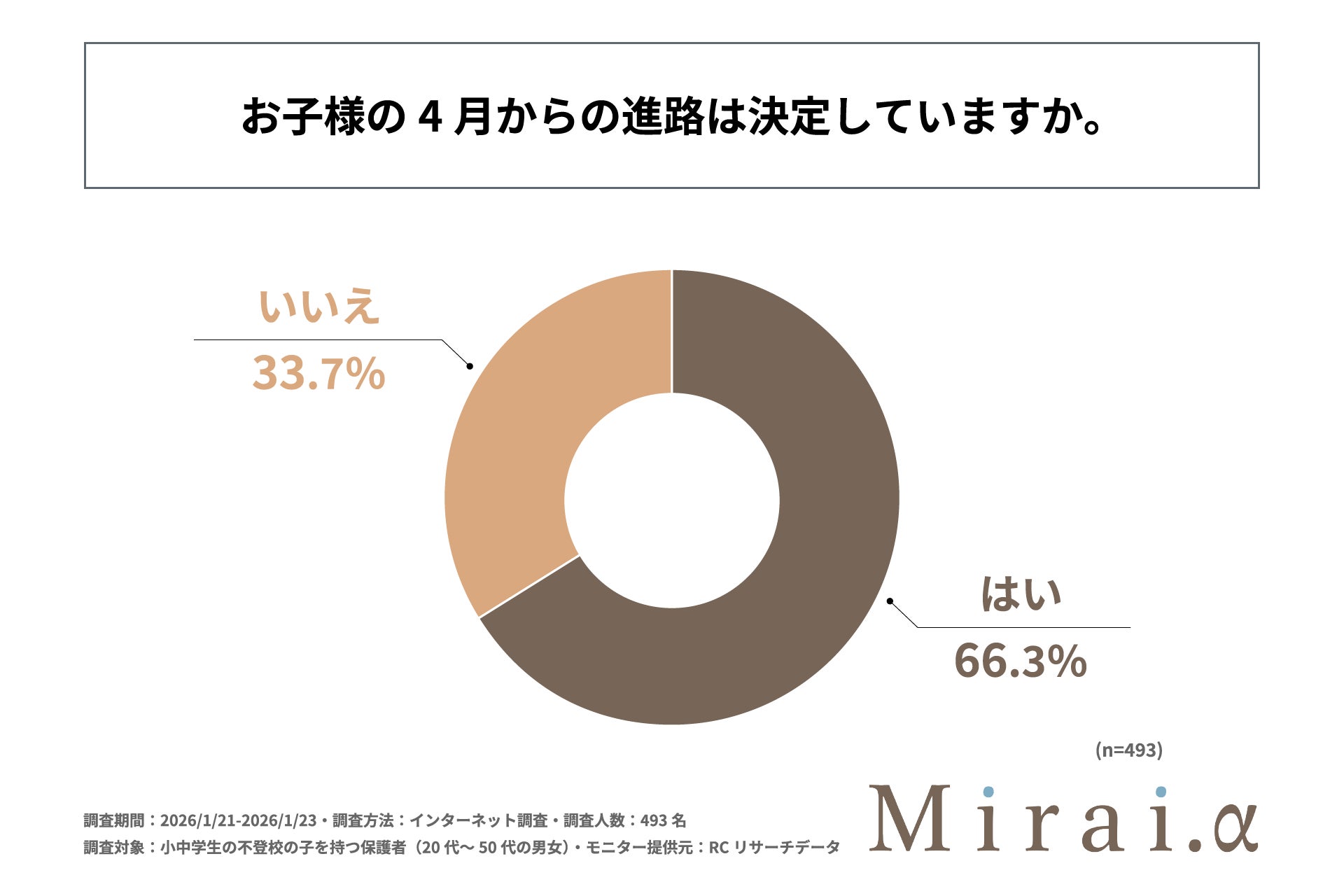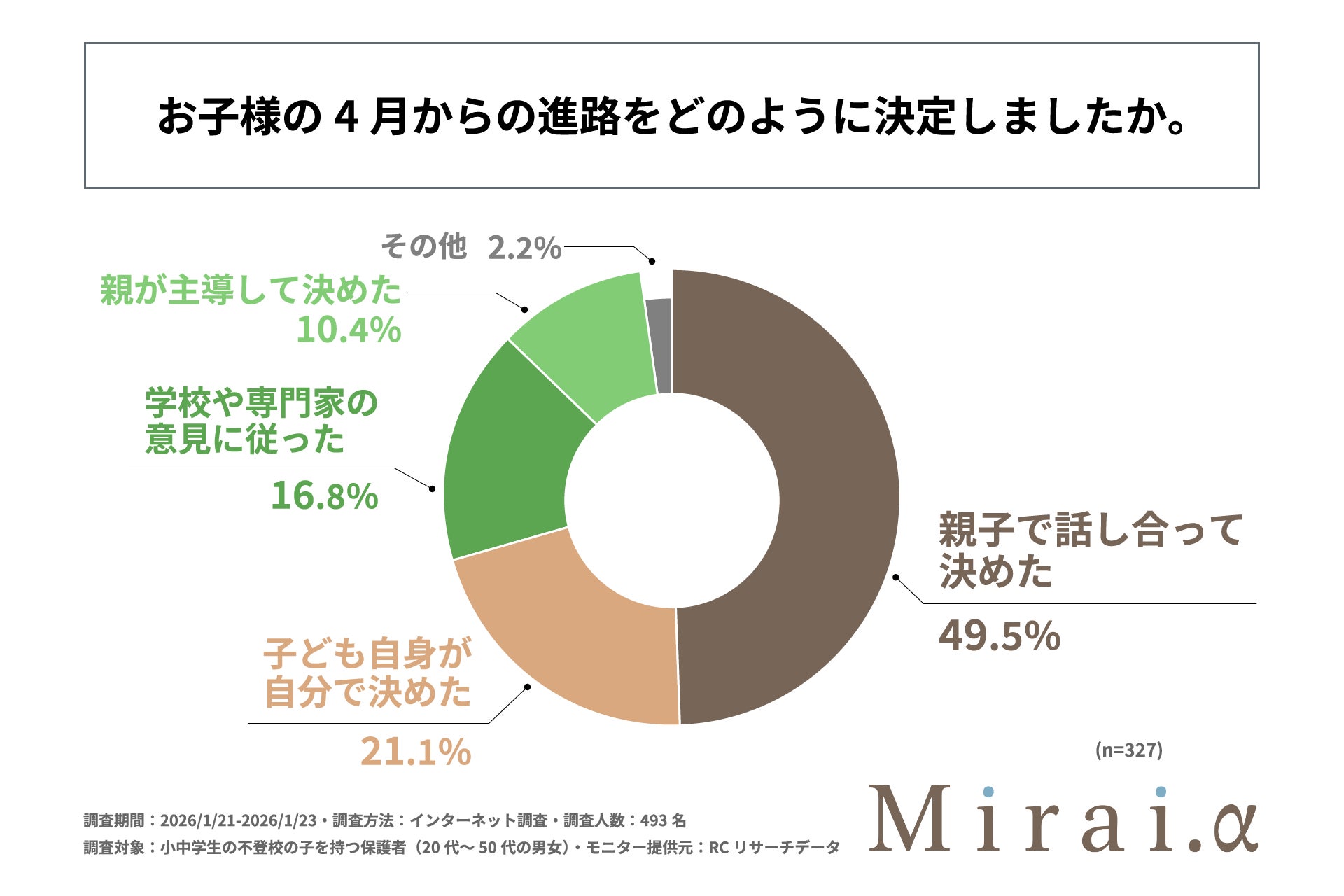 合同会社Mirai.y(本社:東京都目黒区、代表社員:丸林 友美)が運営する「Mirai.α」は、小中学生の不登校の子を持つ保護者(20代~50代の男女)を対象に「小中学生の不登校の子を持つ保護者が考える、子どもの4月からの進路に関する調査」を実施しました。この調査から、小中学生の不登校の子を持つ保護者の、子どもの4月からの進路に関する決定状況やその決め方、情報収集における実態や課題などが明らかになりました。