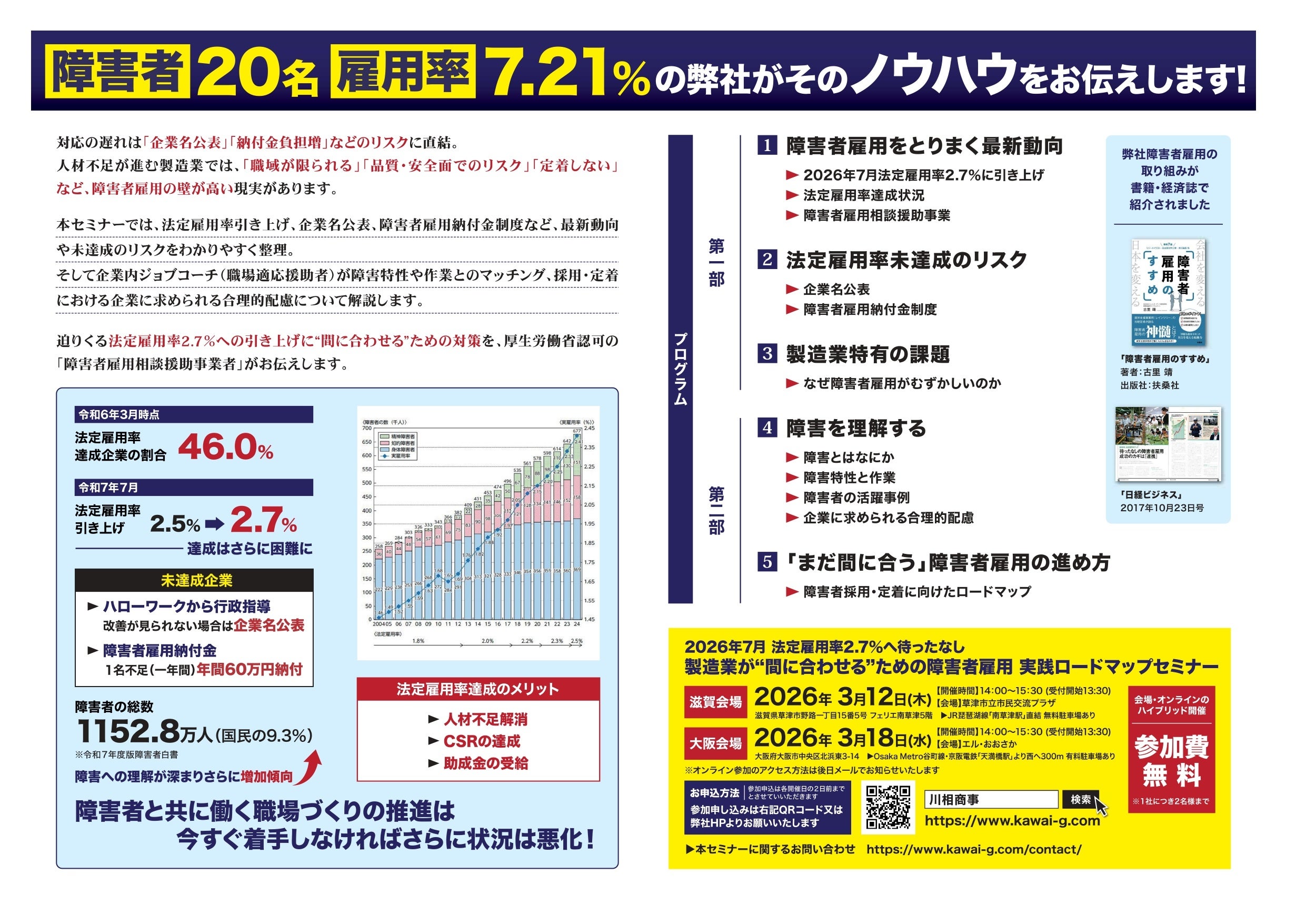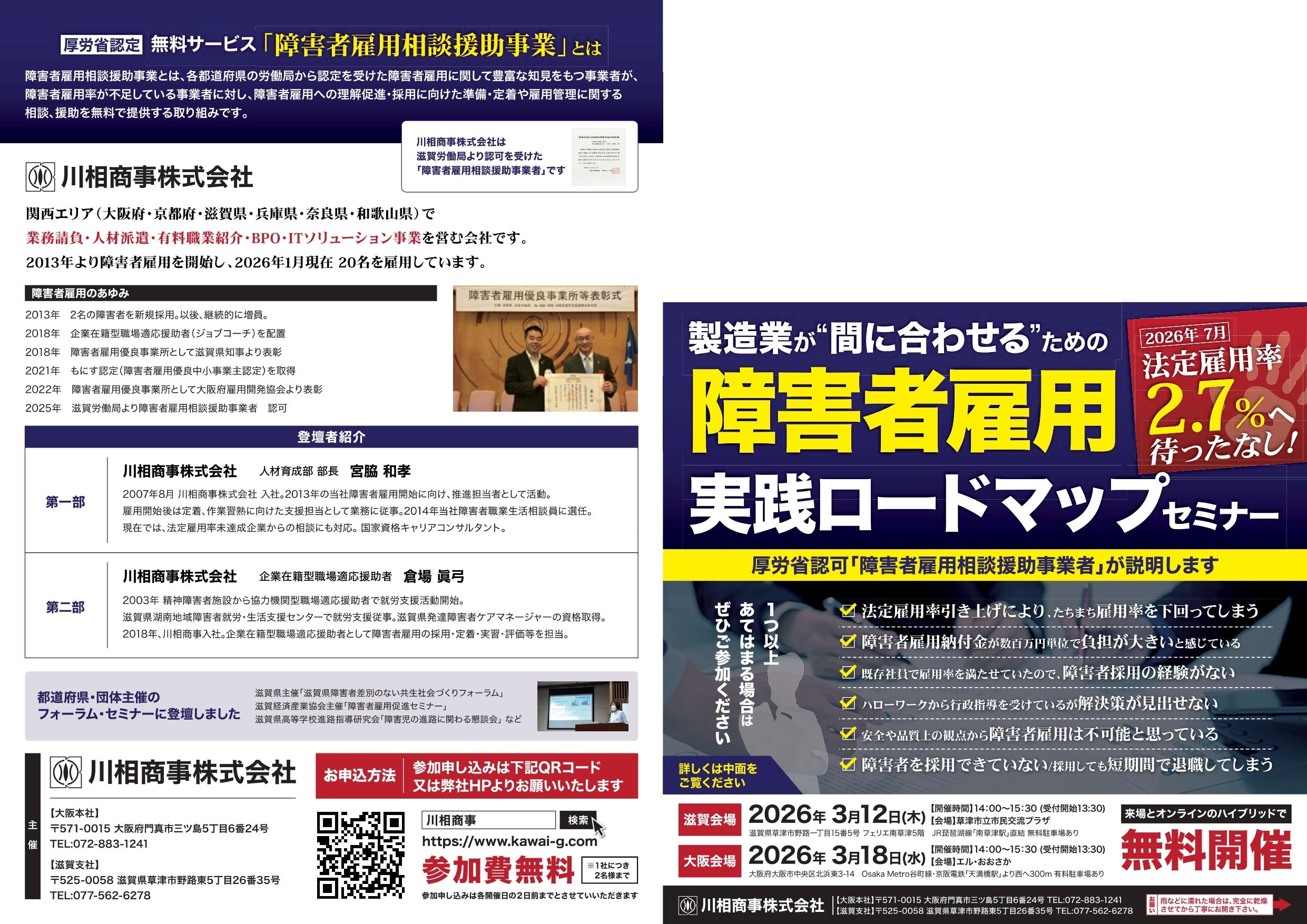 厚労省認可「障害者雇用相談援助事業者」の川相商事が、製造現場の雇用ノウハウを公開。2026年法改正対応・無料セミナーを開催