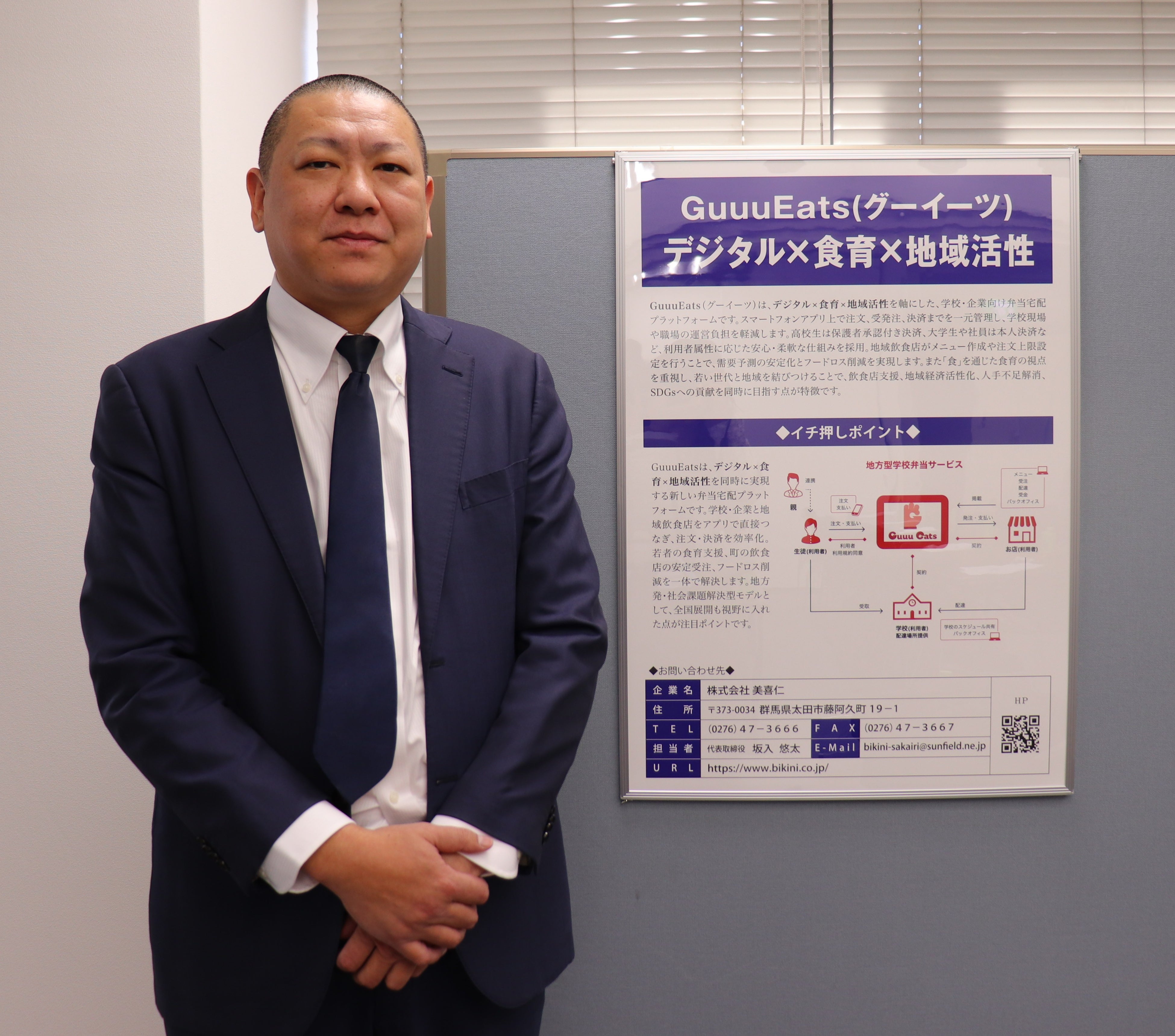 (株)美喜仁では、アプリ「Guuu Eats」を開発。学校や企業の弁当希望者と飲食店のマッチングアプリで、アプリ上で、個人が前日までに飲食店に弁当を注文し、指定の場所に飲食店が配達するサービス。これによりフードロスが無く、家庭の弁当作りの負担を減らし、飲食店の事業継続を支援できる。令和8年4月から「群馬大学」と「ほっかほっか大将」による実証実験を桐生市にて行い、その後、群馬県内や全国展開していきたい。