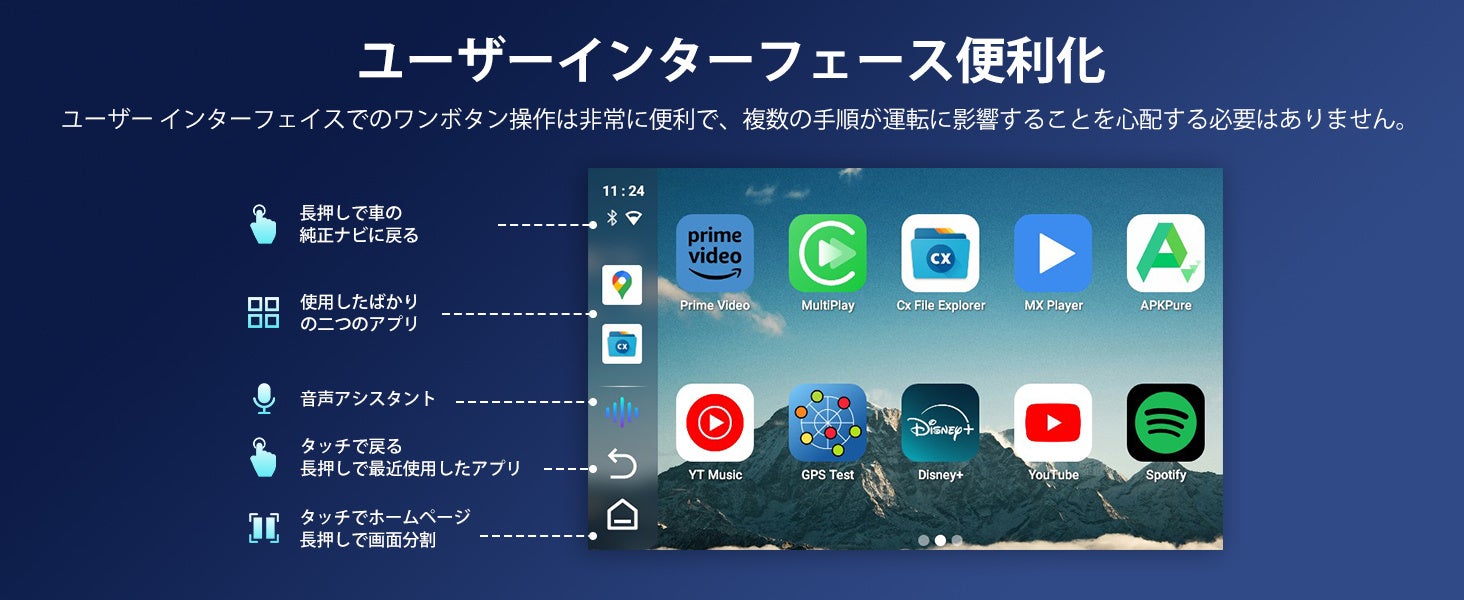 Android 12、ワイヤレスCarPlay/Android Auto、動画視聴、画面分割、GPS、SIM/SD対応まで。