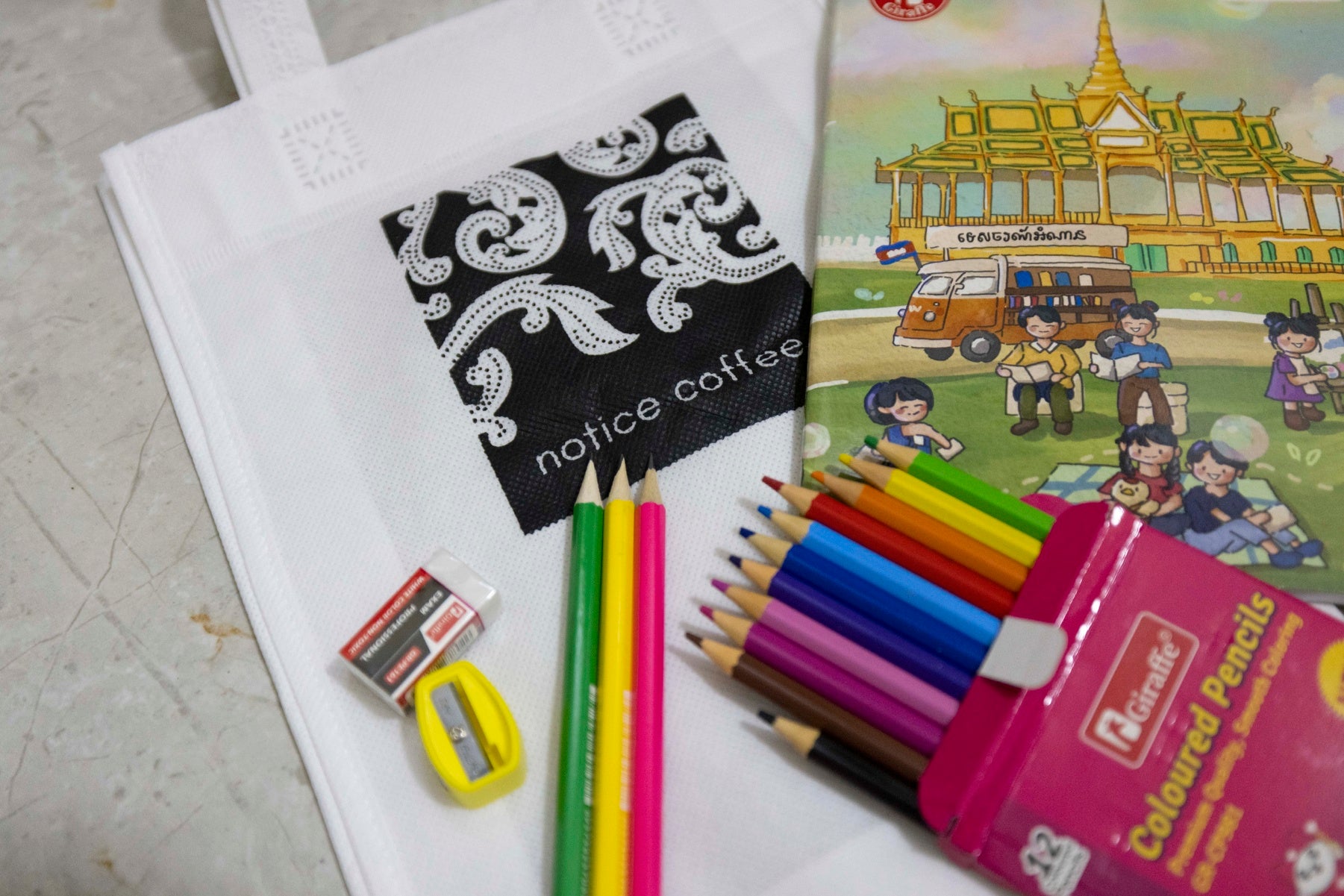 notice coffeeでは、利益の15%でカンボジアの子どもたちに文房具を届けています。
