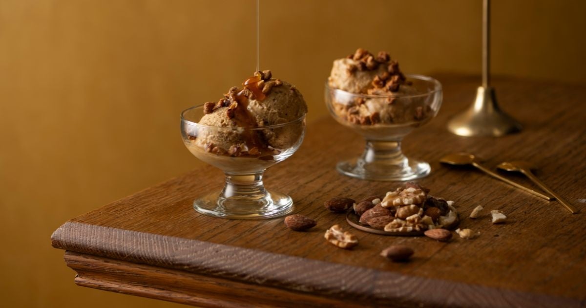 なめらかなキャラメルアイスに、アーモンド・ヘーゼルナッツ・くるみの3種のナッツを贅沢に使用。