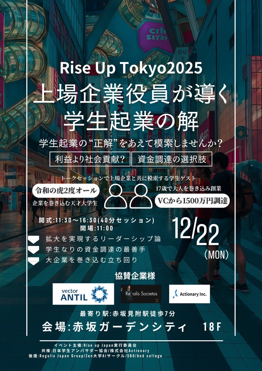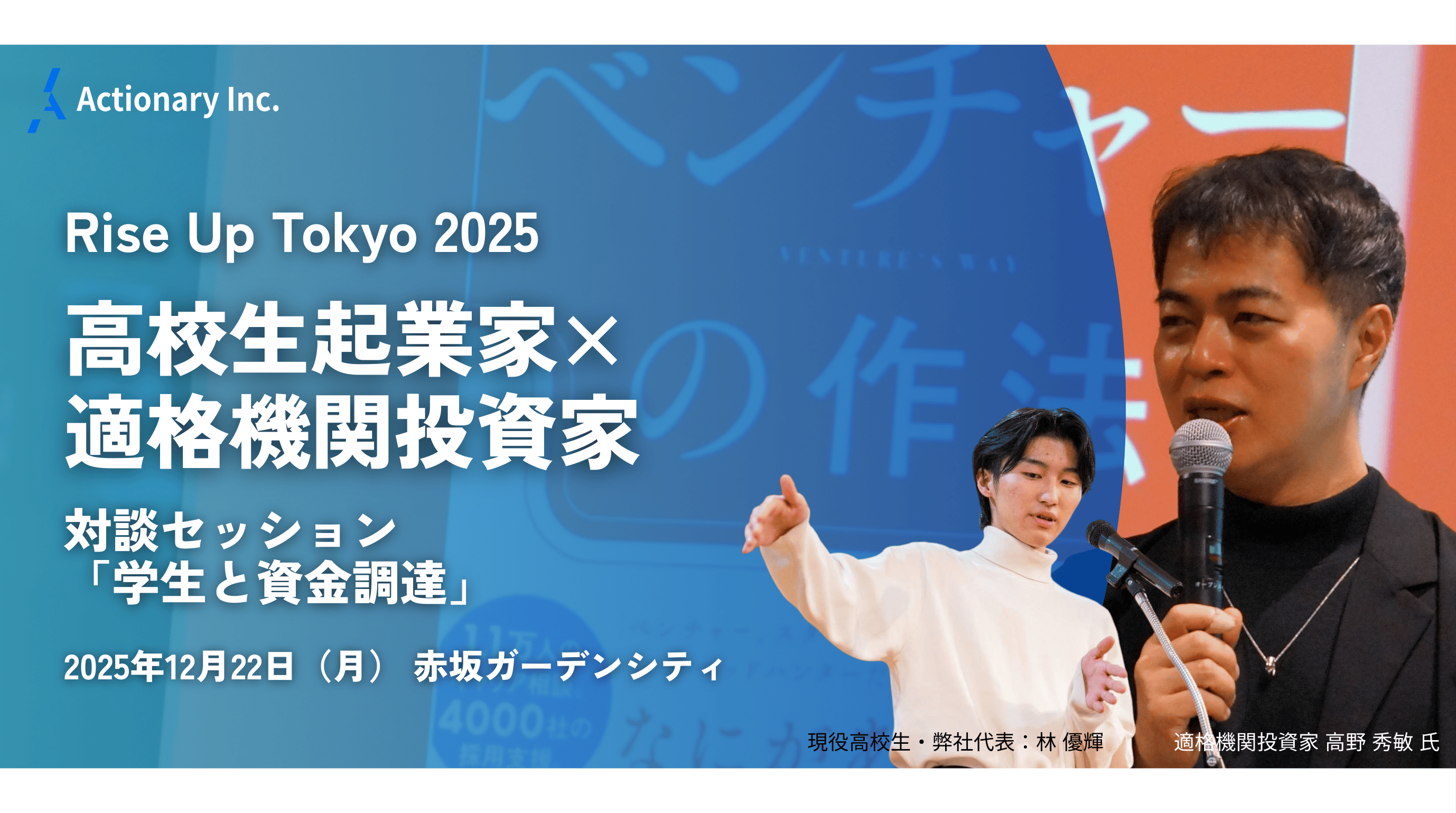 株式会社Actionary(本社:東京都港区、代表取締役CEO:林優輝)は、2025年12月22日(月)に赤坂ガーデンシティ 18Fにて開催される次世代イノベーター育成イベント「Rise Up Tokyo 2025」に共催企業として参画し、代表の林優輝が「学生と資金調達」セッションに登壇することをお知らせします。本イベントは、CFOとして2度のIPO経験を持つ専門家や、70社以上にエンジェル投資を行う著名投資家など、実務の最前線で活躍するプロフェッショナルが学生起業家に向けて「夢を語るだけでなく実際に実現するための具体的方法(How To)」を伝えることに特化したカンファレンスです。