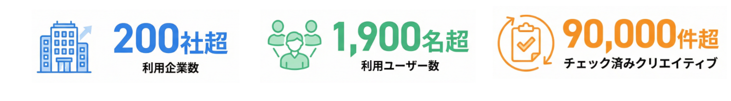 AdKuraは、広告クリエイティブの共有・レビュー・承認フローをクラウド上で一元管理できるSaaSです。D2Cブランド・美容クリニック・健康食品/サプリメント企業など、薬機法・景表法対応が求められる事業者を中心に、現在200社以上・1,900名以上のユーザーにご利用いただいています(2026年1月時点)。