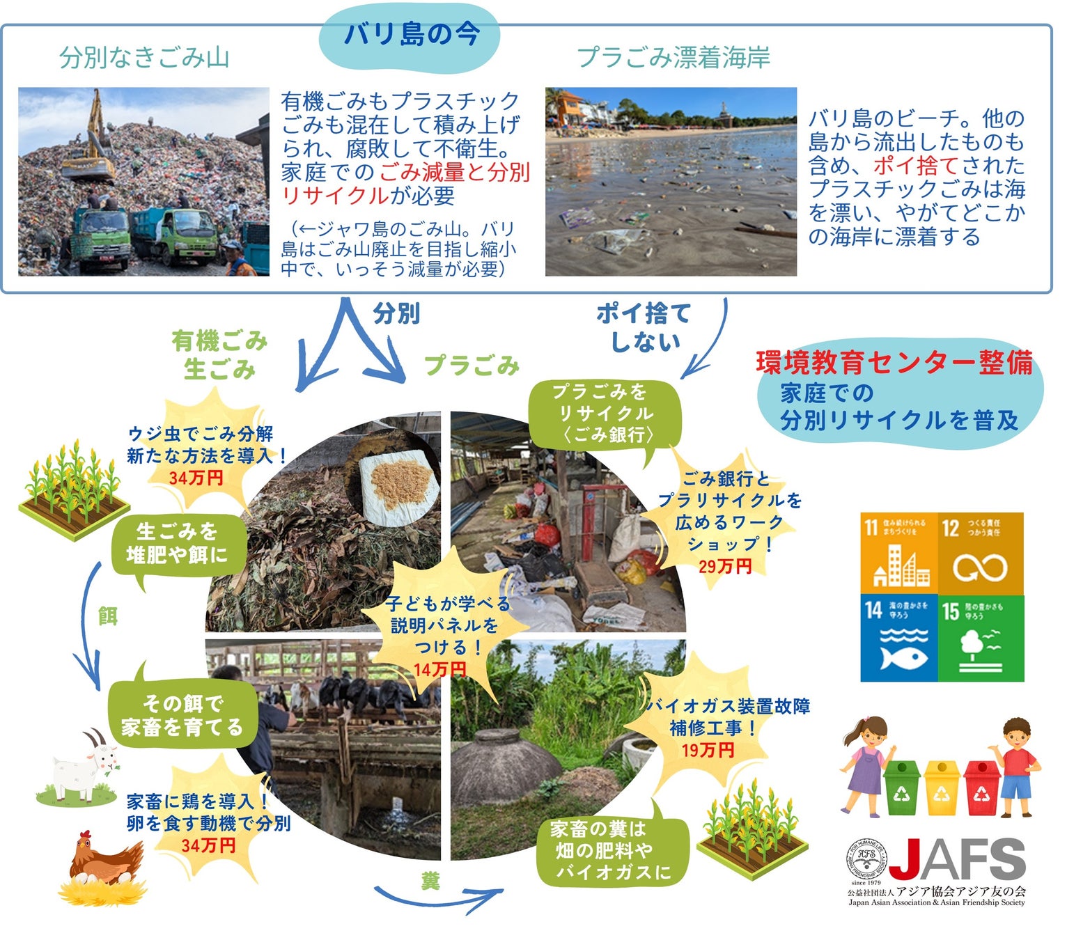 ご寄付は、バリ島の環境教育センター整備に使わせていただきます。10年以上前に、有機ごみを農畜産業に利用するためのパイロット施設をつくっていました。老朽化したその施設を修繕および改良するかたちで、プラスチックごみも対象とする環境教育センターとして再整備します。