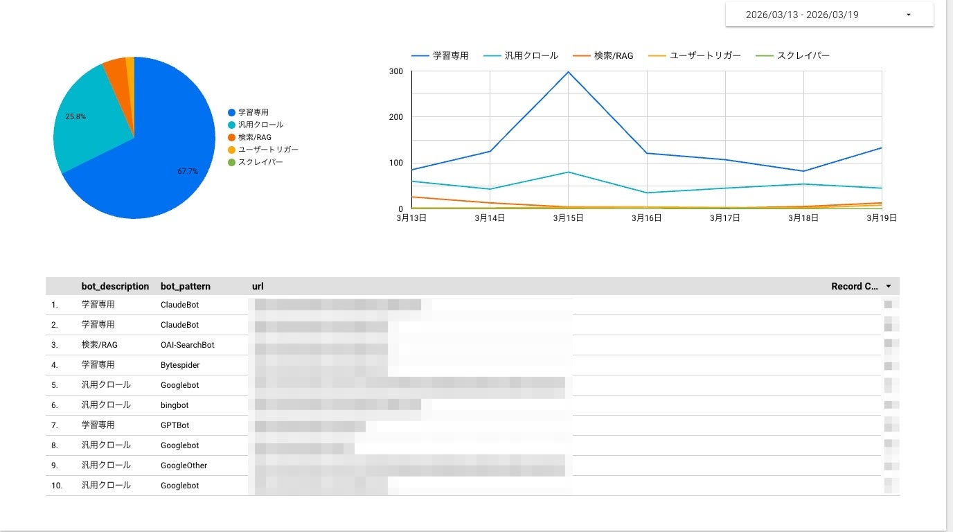③AIボット解析(EdgeShaping)CDNエッジログを活用した独自解析技術により、従来の計測ツールでは存在すら見えなかったAIボットのアクセス領域を可視化。65種類以上のボットを識別し、GA4の計測範囲外で起きている自社コンテンツの消費実態を把握できるようにします。