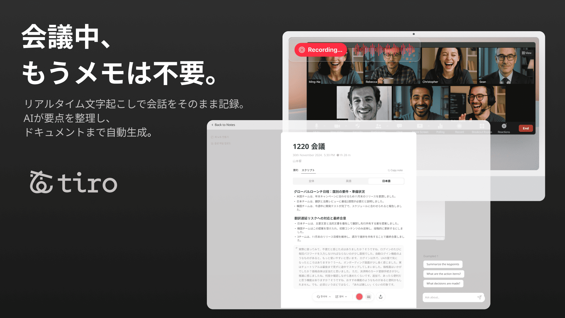 「ビジネスの現場では、言語の壁や、重要な対話が記録されずに埋もれてしまうという課題が長年続いてきました。Tiroは、あらゆる対話を記録・整理・構造化することで、一過性で終わっていたコミュニケーションを組織の貴重な資産へと転換することを目指しています」