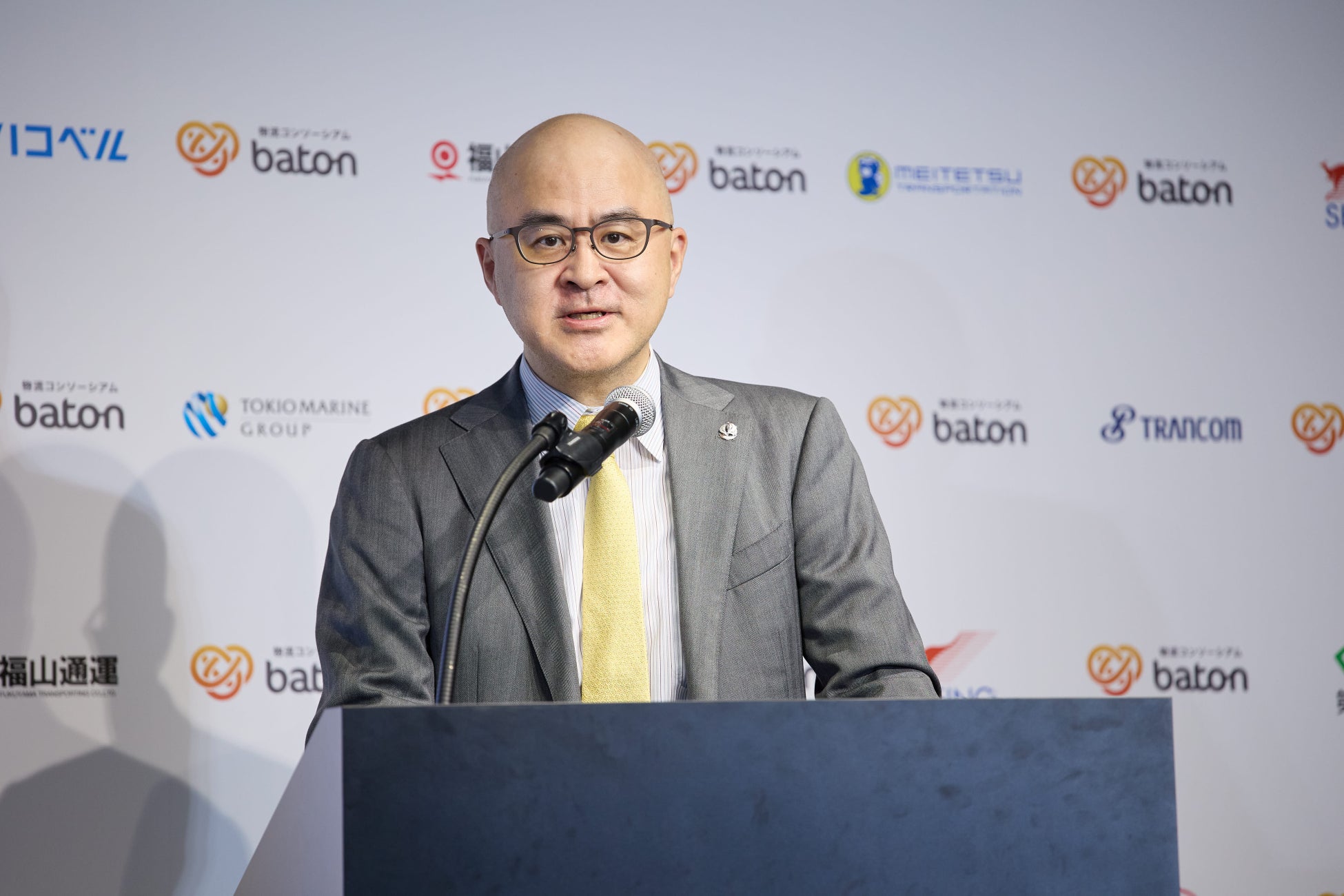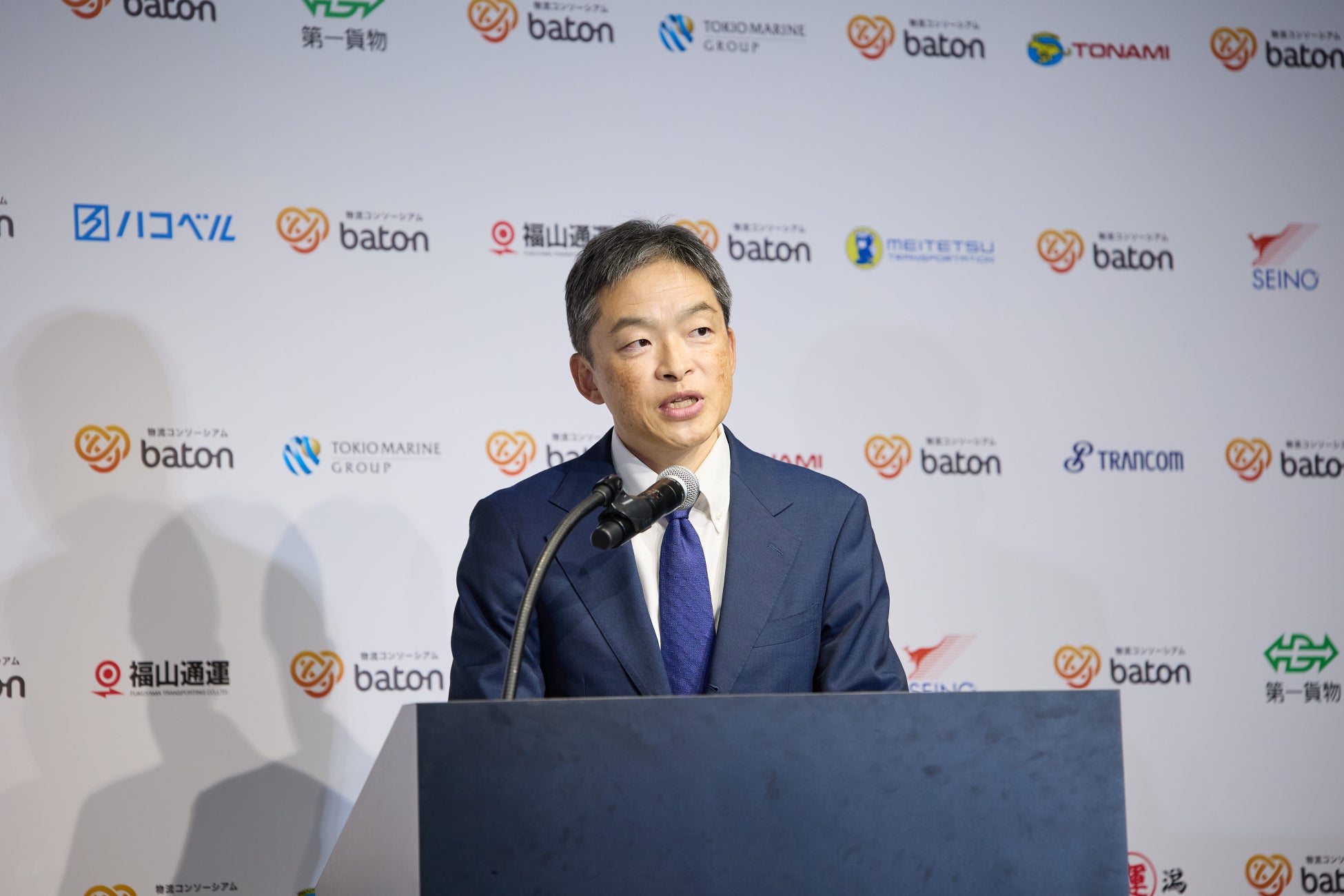 東京海上日動火災保険株式会社 取締役社長 城田 宏明氏からは、baton における取り組みと進捗を紹介しました。城田氏は、東京海上グループが1879年の創業以来、物流リスクを補償する保険を原点として事業を展開してきた歴史を振り返り、「現在は企業の垣根を超えた連携で強靭なサプライチェーン構築に挑んでいる」と述べました。batonでは、中継輸送を軸に企業間協力による効率的で無理のない長距離輸送体制を目指しており、「参加企業から提供された輸送量上位20路線のデータを基に、週あたり1万3,000便超の情報を分析。企業間連携でより効率的な輸送の実現に向けた確かな手応えを感じている」と説明しました。