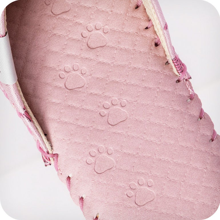 生地には京都・西陣織の可憐な猫柄テキスタイルを用い、手編み製法により1足ずつ丁寧に仕上げています。 中敷きには猫好きにはたまらない足跡の型押しを施し、履くたびに笑みがこぼれる、遊び心満載の“猫愛”を感じられる特別な一足です。