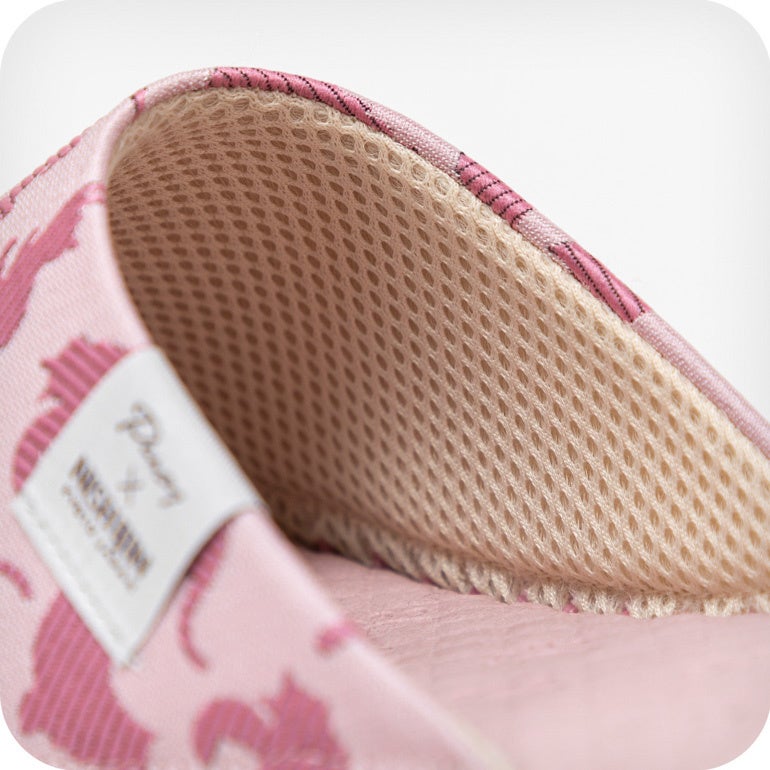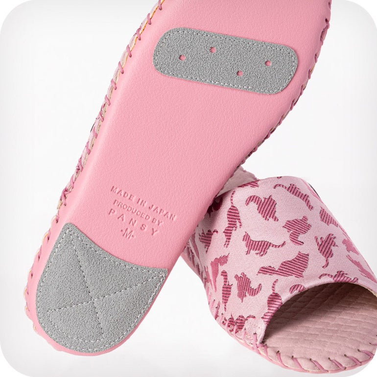 ひとつひとつ手作りで生まれる、世界に200足だけの「猫」。こだわりのものづくりを続けているパンジーが初めて挑んだ猫柄は、高級感あふれる西陣織の生地と、愛らしい猫の足跡を施した中敷きで遊び心もプラス。手編みによる履き心地の良さを贅沢に感じられる日本製の逸品です。