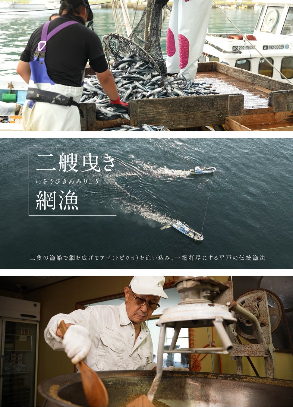 30秒版動画では、「情熱大陸」などで知られる窪田 等氏のナレーションにのせて、早朝の平戸の海や漁の風景、炭火で焼き上げられるあご、加工・製造の様子を通じ、「上品なコク」と「澄んだ旨み」が生まれる背景を、静かで情緒あるトーンで描いています。