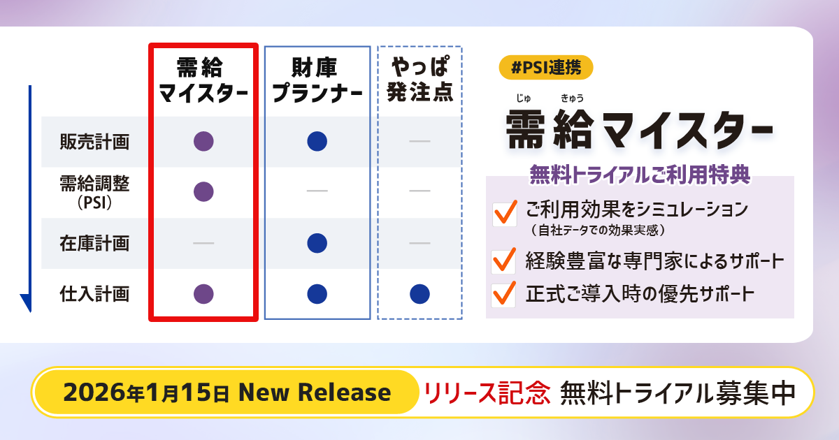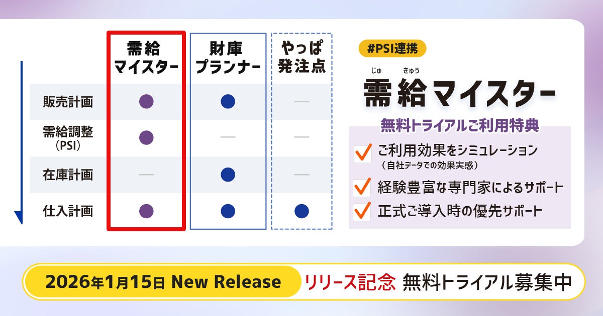 新製品「需給マイスター」の提供開始に伴い、現在、無料トライアルを限定募集しています。