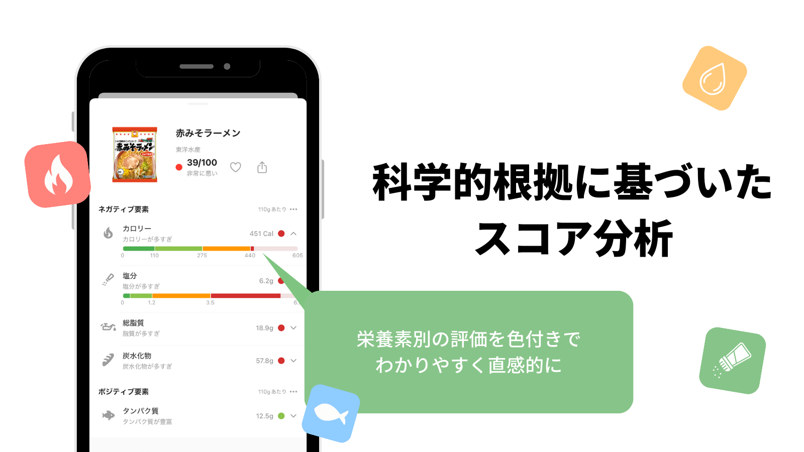国立研究開発法人医薬基盤・健康・栄養研究所(NIBN)の栄養プロファイルモデルを参考に、独自のアルゴリズムで商品を解析。