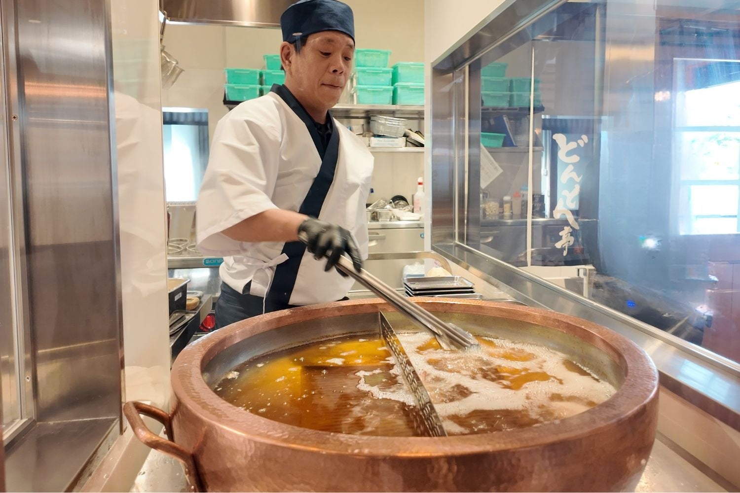 また、機械では再現できない厚みや食感にこだわり、店内で職人が一枚一枚丁寧に「手切り」しています。焼き上がりの美しさと、口の中に広がる肉汁のハーモニーをお楽しみください。