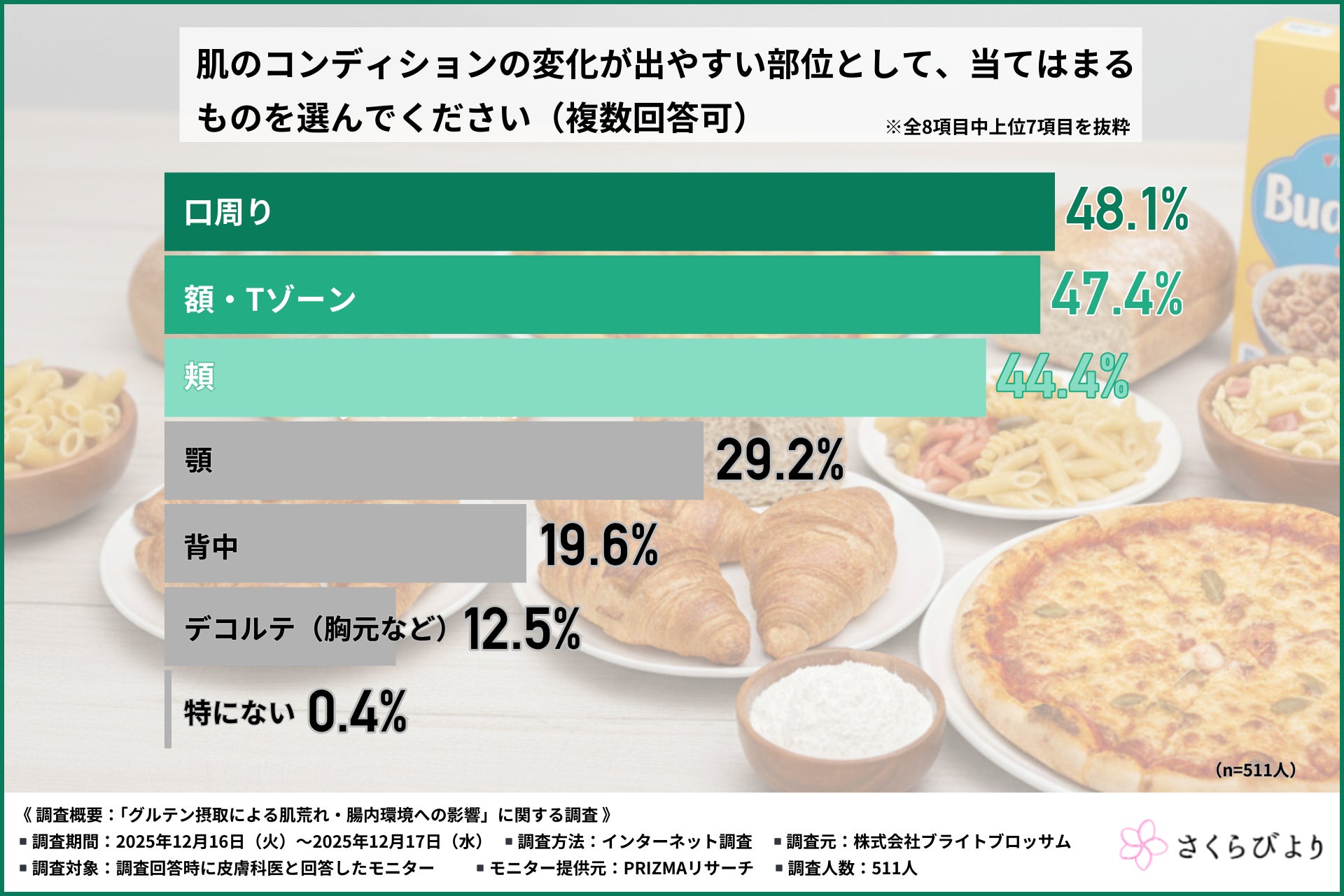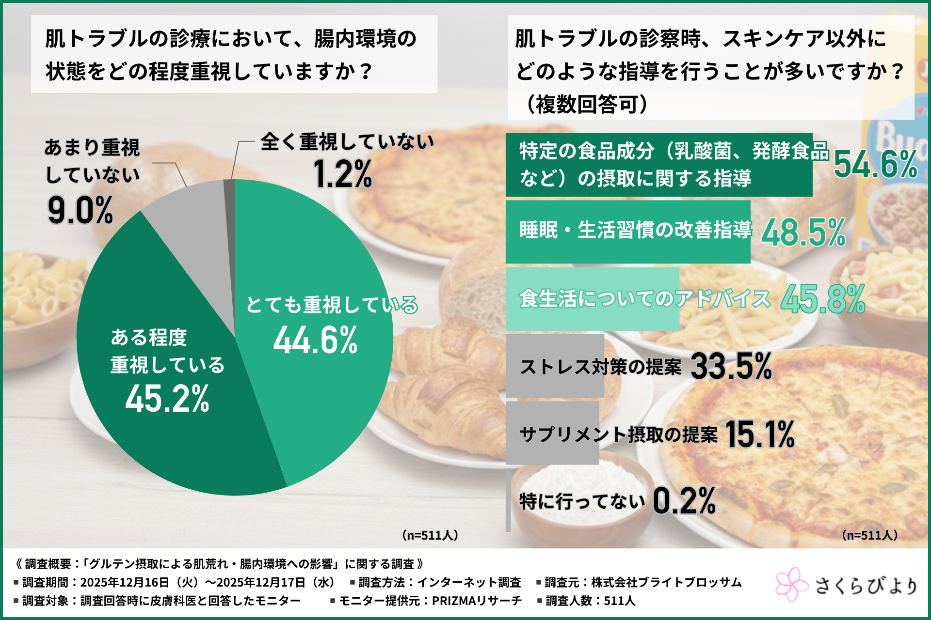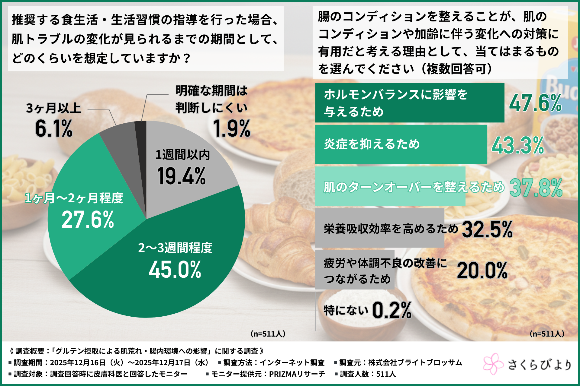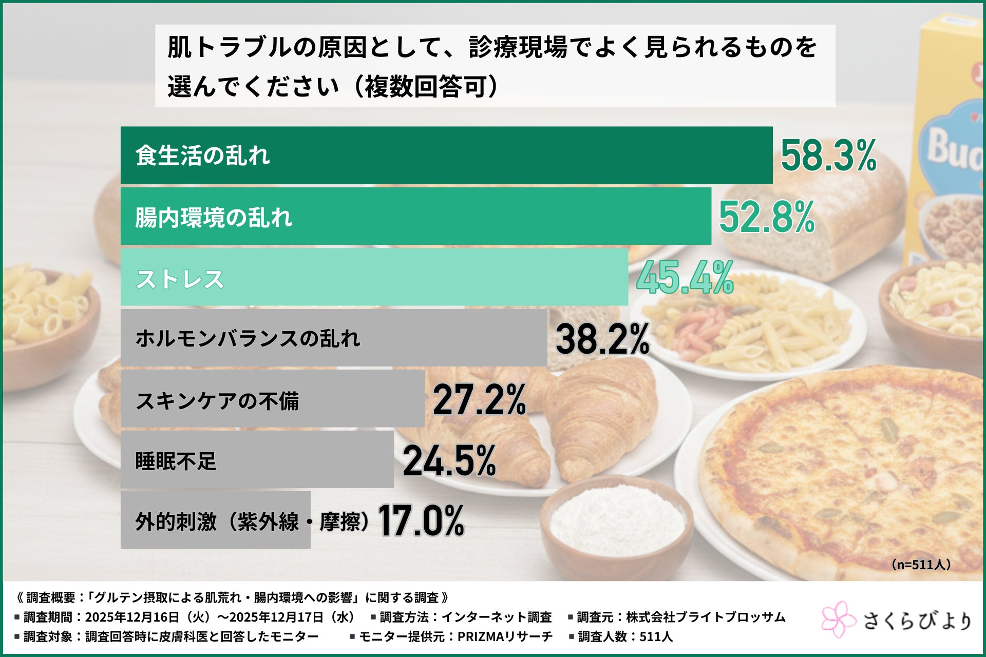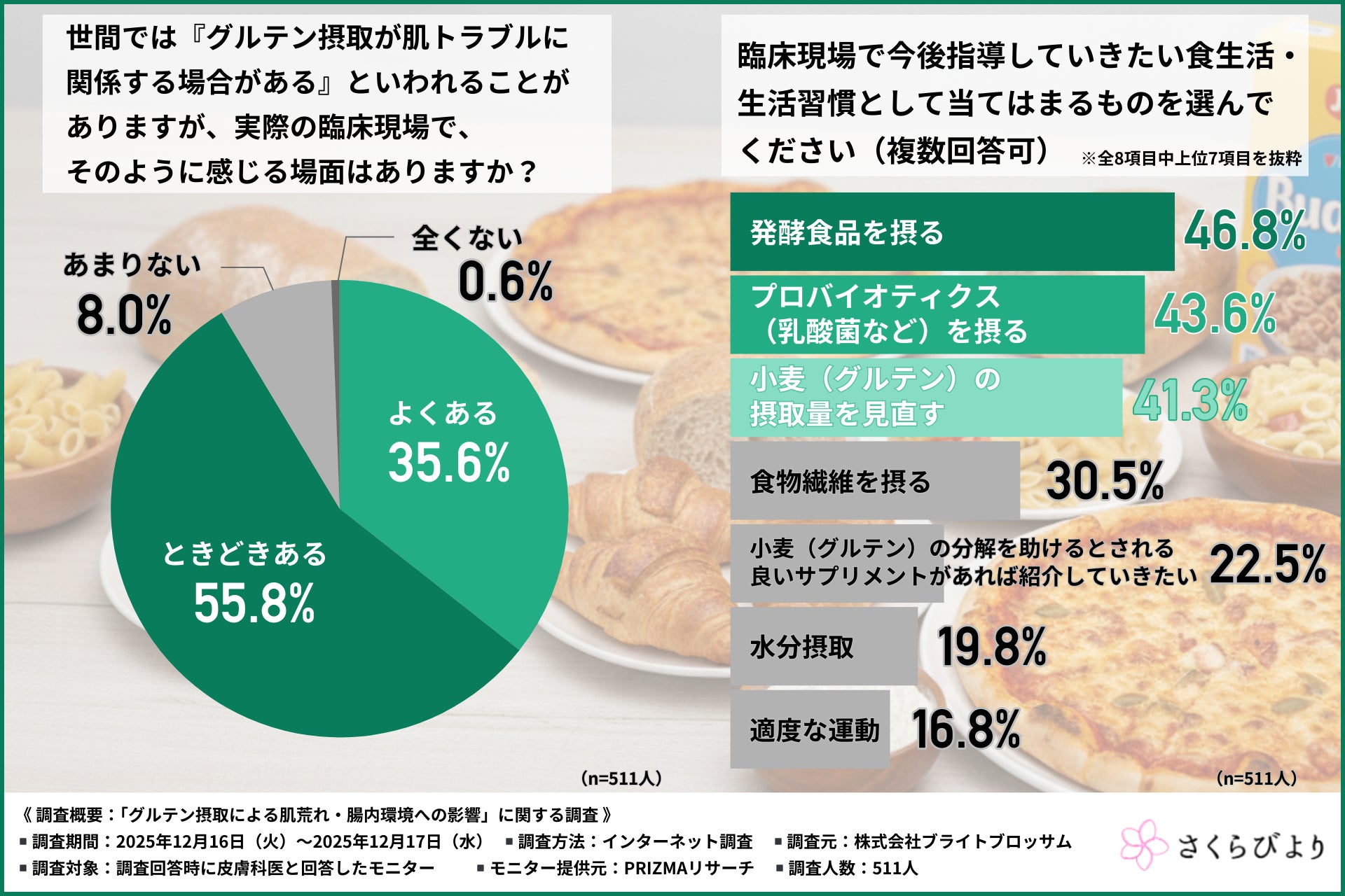 そこで今回、株式会社ブライトブロッサム(https://br-blossom.com/)は、皮膚科医を対象に、「グルテン摂取による肌荒れ・腸内環境への影響」に関する調査を行いました。
