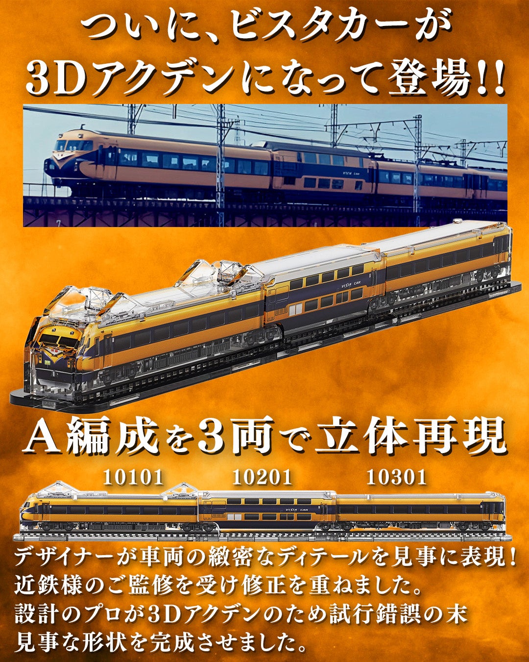 渡辺車輌工業株式会社(本社:大阪府寝屋川市 代表取締役:浅井輝明)は創業以来68年にわたり鉄道車両の清掃事業を通じて電車と深く関わってきた経験を活かし、日本初のアクリル製立体鉄道模型の組立てキット「3Dアクデン」を展開しております。2024年の発売以来、京阪電車シリーズ「特急8000系」や「3000系」が鉄道ファンから高い評価を得ており、近鉄「ひのとり」「8A系」JR新幹線「923形ドクターイエロー」、「500系のぞみ」などの商品化を経てこの度、昭和時代に活躍した近鉄「10100系新ビスタカーA編成」3両セットの販売を開始しました。