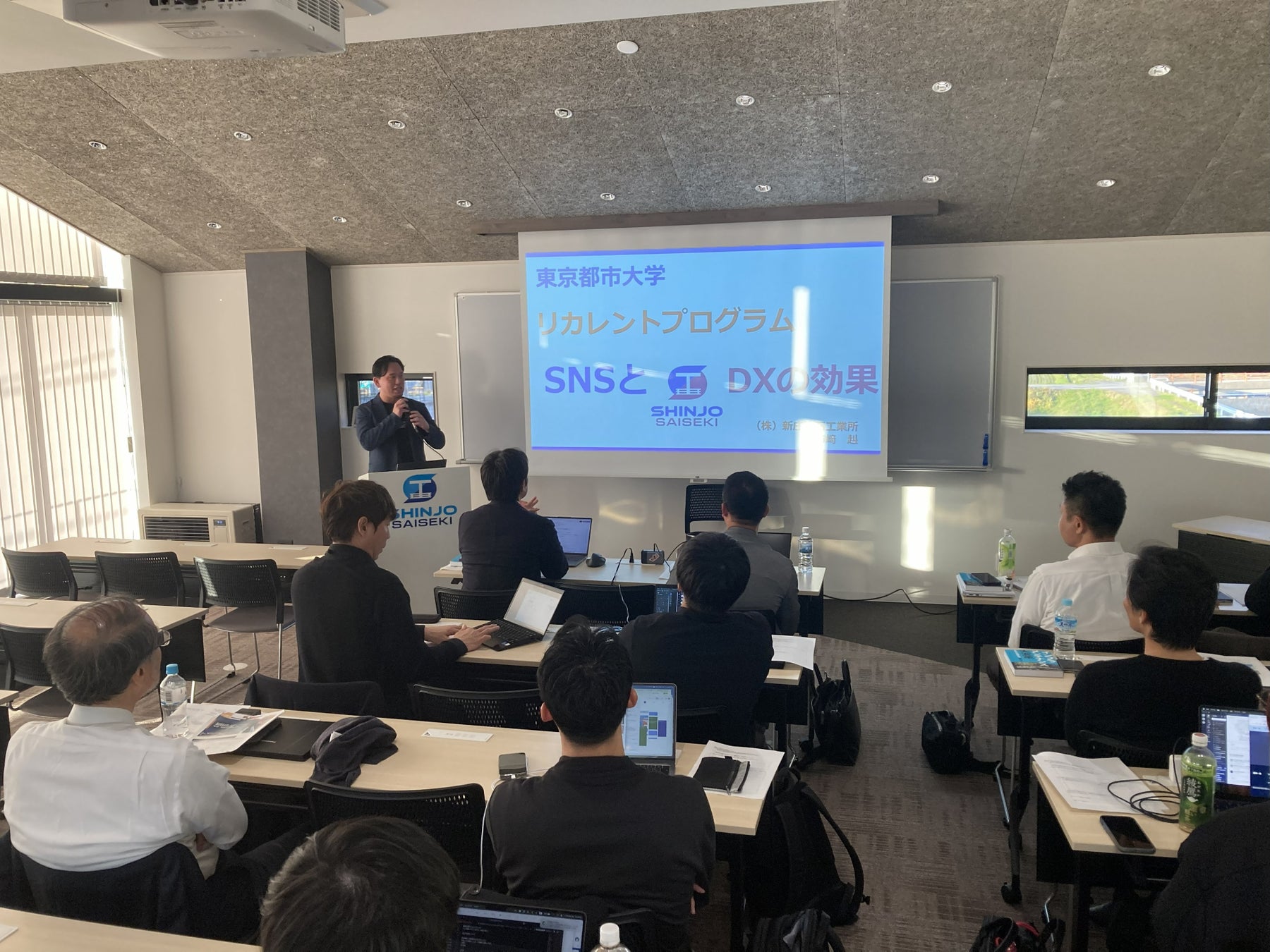 株式会社新庄砕石工業所(本社:山形県新庄市、取締役管理部長:柿﨑赳 他当社社員5名)は、東京都市大学リカレントプログラム(※)「建設業事業承継 DX コース」の参加者を対象とした特別研修を開催し、無事に終了いたしました。本研修では、当社の中期戦略(MVV)やDX推進の取り組み、内閣府ムーンショット連携プロジェクトによる無人化施工、VR/AR活用、道路AI点検、そして事業承継まで、現場の“リアル”を交えながら幅広い内容を提供しました。