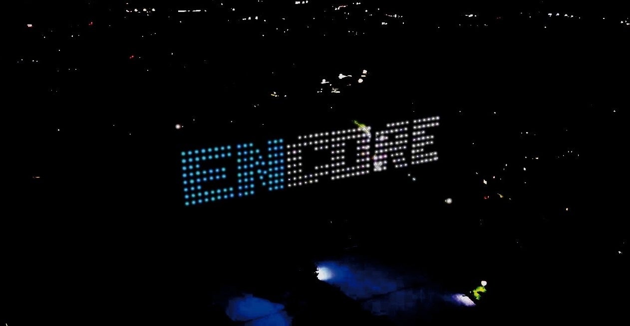 ドローンショーは18:00より約10分間飛行し、471機のドローンによる精密なフォーメーションと光の演出が、16年ぶりの来日公演の前夜を彩りました。