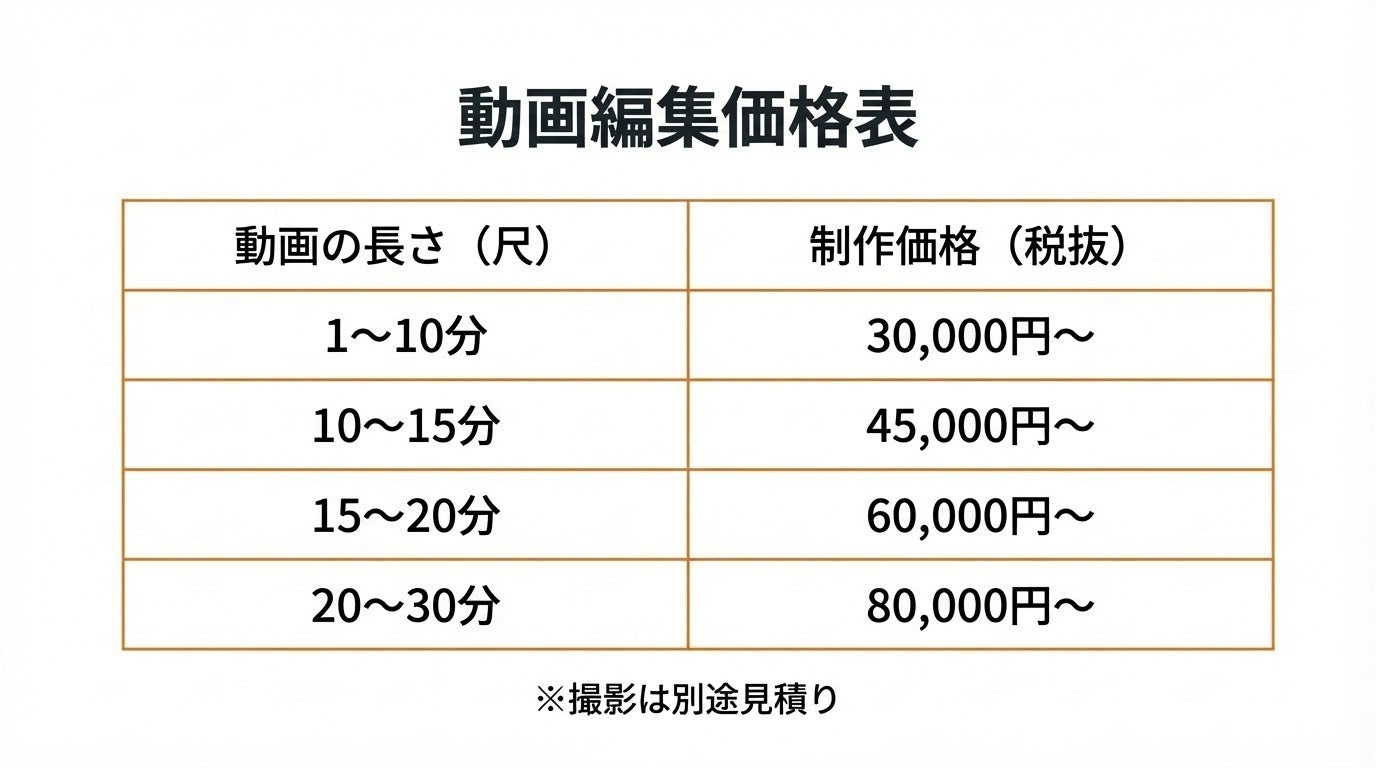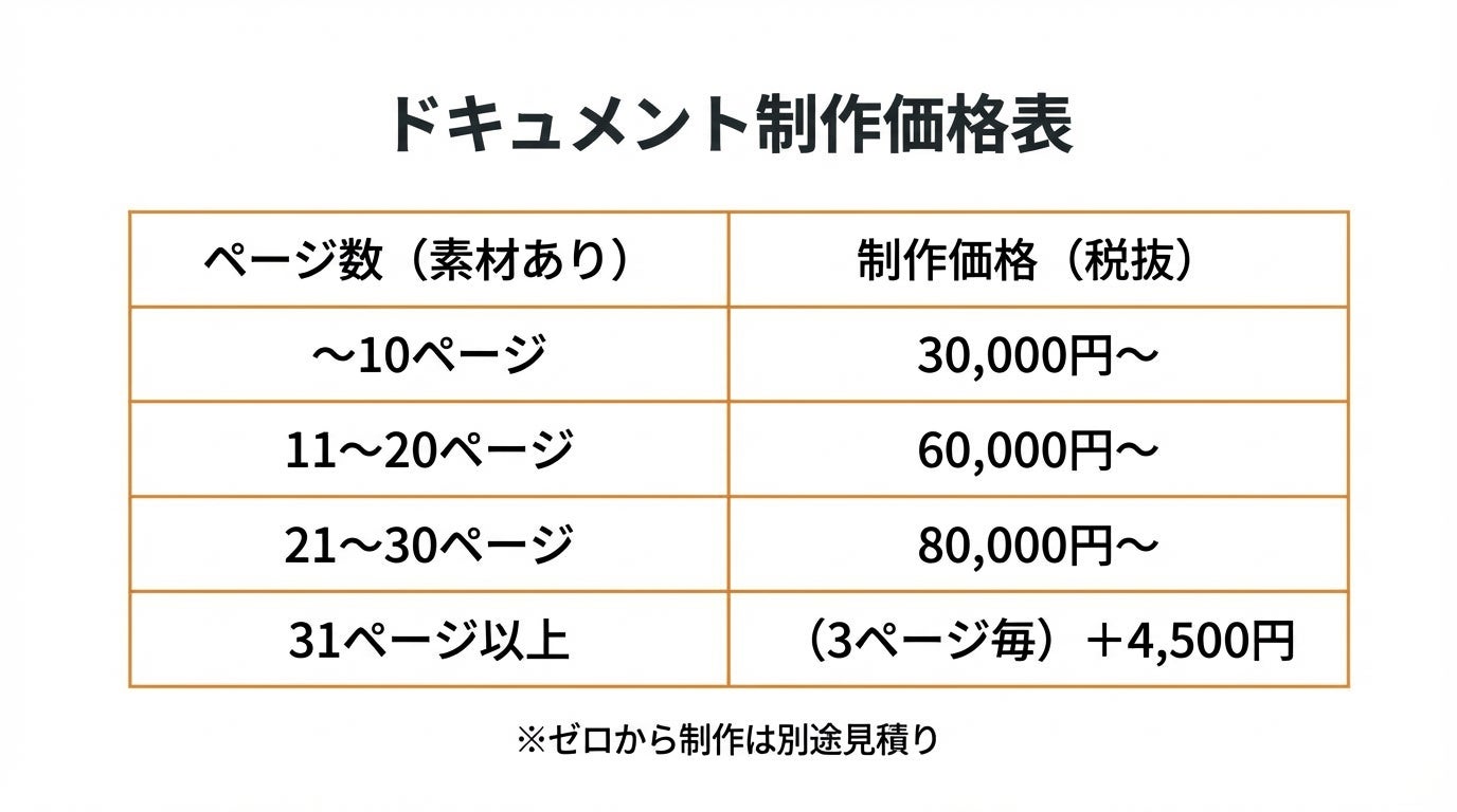 料金については、制作物の種類・分量・運用範囲によって変動するため、ヒアリング後に個別見積で提示します。