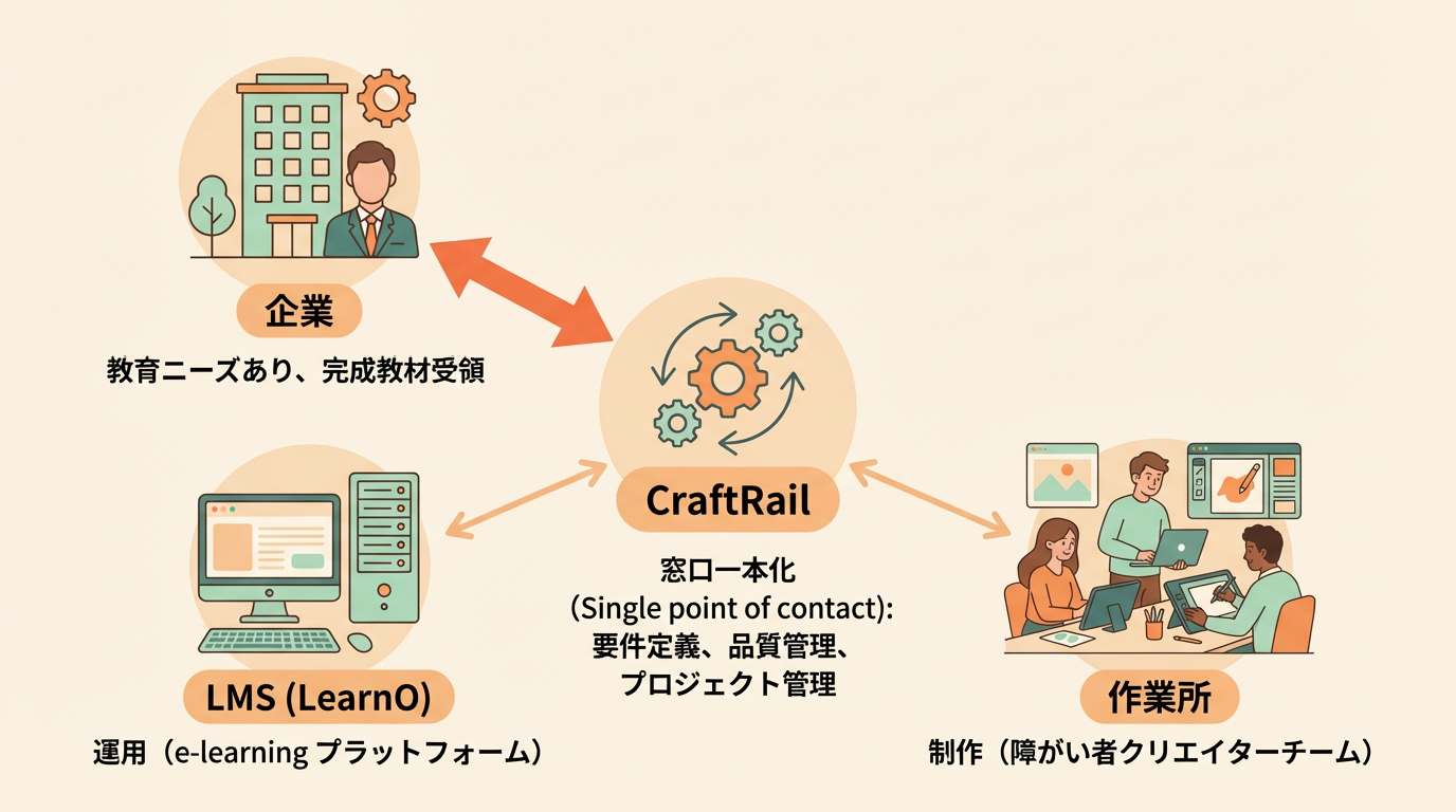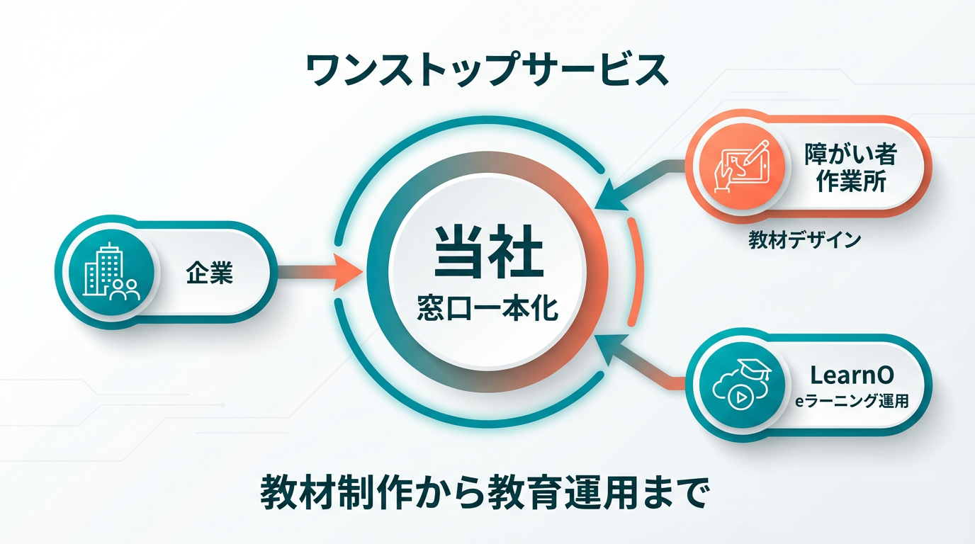 本プロジェクトでは、当社が窓口として課題ヒアリング、要件整理、進行管理、品質管理を担い、制作実務はデザインを強みとする障がい者作業所スタッフが担当します。さらに、教材をeラーニングで運用したい企業・組織には、Mogic株式会社のLearnO(ラーノ)を活用し、初期設定や運用準備まで含めた導入支援を行います。これにより、企業側は窓口分散や進行の複雑化を避けながら、教材制作から教育運用までを一気通貫で進められます。