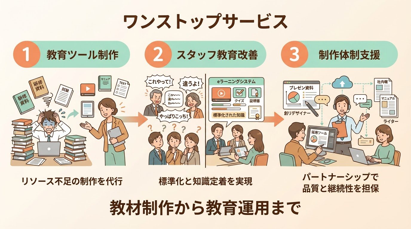 本プロジェクトは、企業・組織の教育や制作に関する課題を、**「相談窓口」「制作体制」「運用支援」**の3つを一体で提供するサービスです。