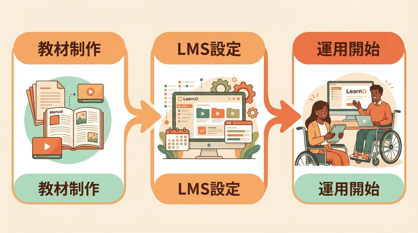 LearnOの初期設定等は、障がい者作業所スタッフが対応できる体制も整えています。これにより、教材制作から運用開始までの流れを一気通貫で進められます。