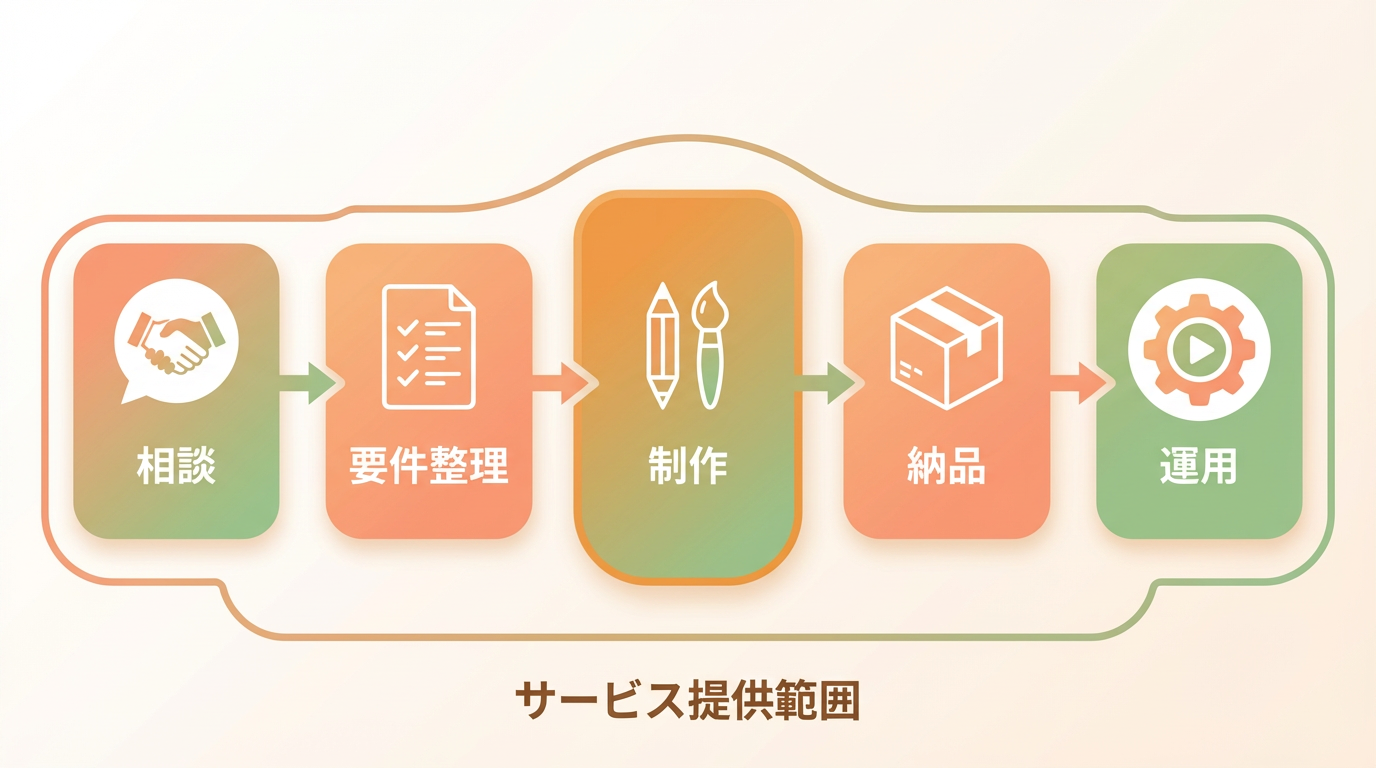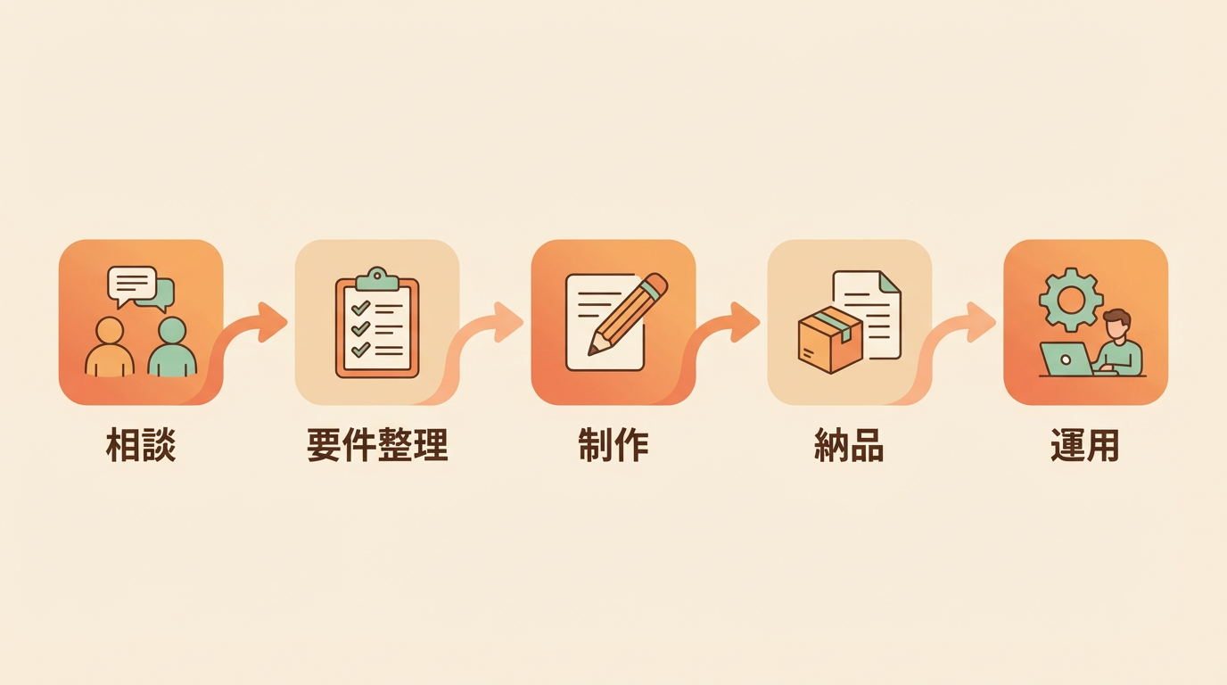 **目的の整理→制作→活用(運用)**までを一つの流れとして設計しています。ここでは、導入から納品・運用開始までの基本フローを説明します。