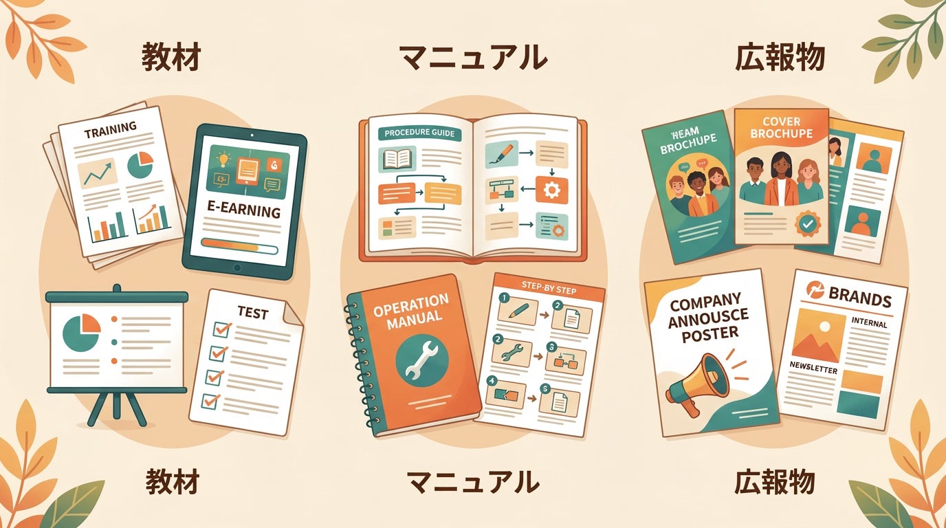 教育用途に限らず、社内説明資料、周知用資料、採用広報物など、制作ニーズは幅広く発生します。