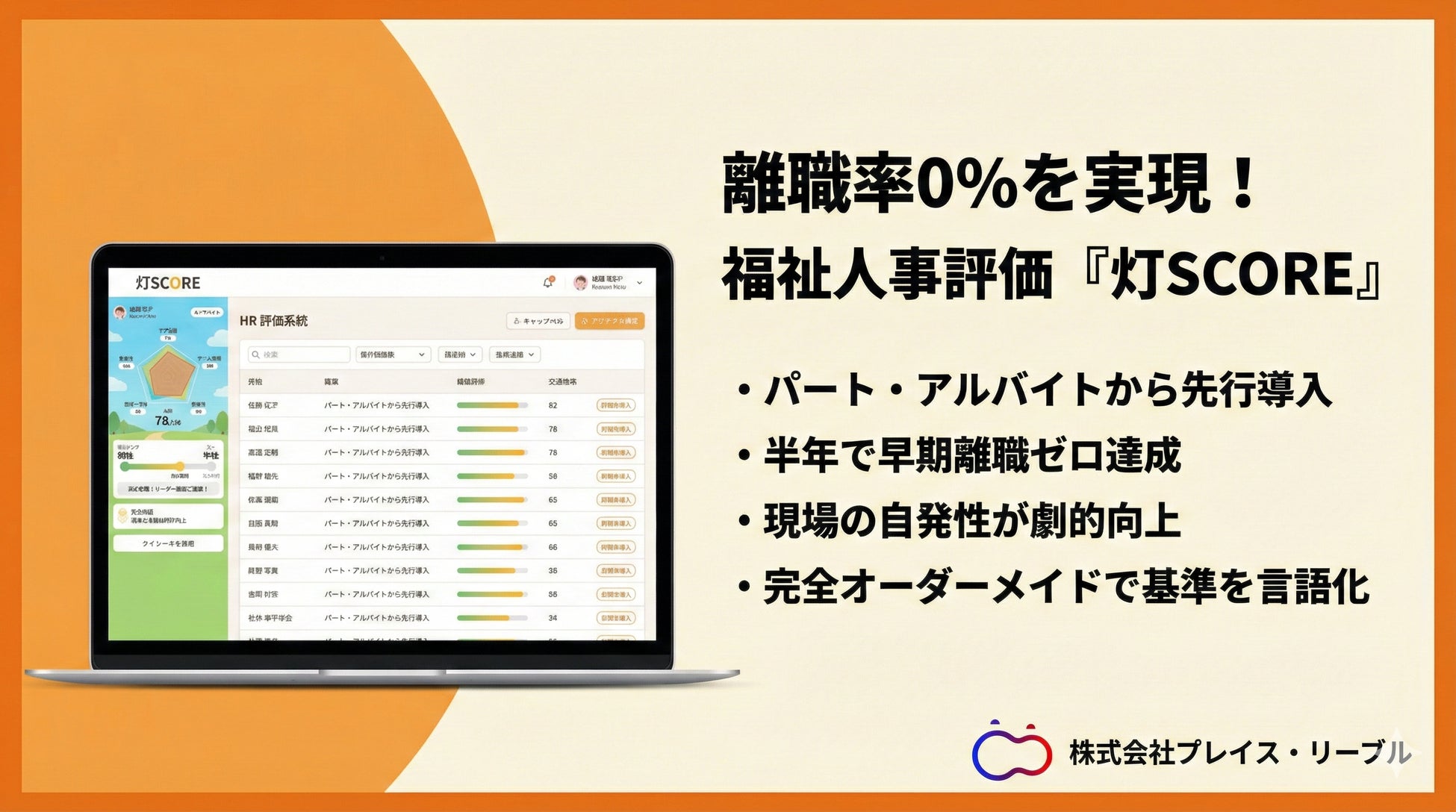 現場の「頑張っても報われない」をシステムで解決。正社員よりパートを優先評価し、半年で離職率0%を実現した組織改革クラウド『灯SCORE』を株式会社プレイス・リーブルが提供開始