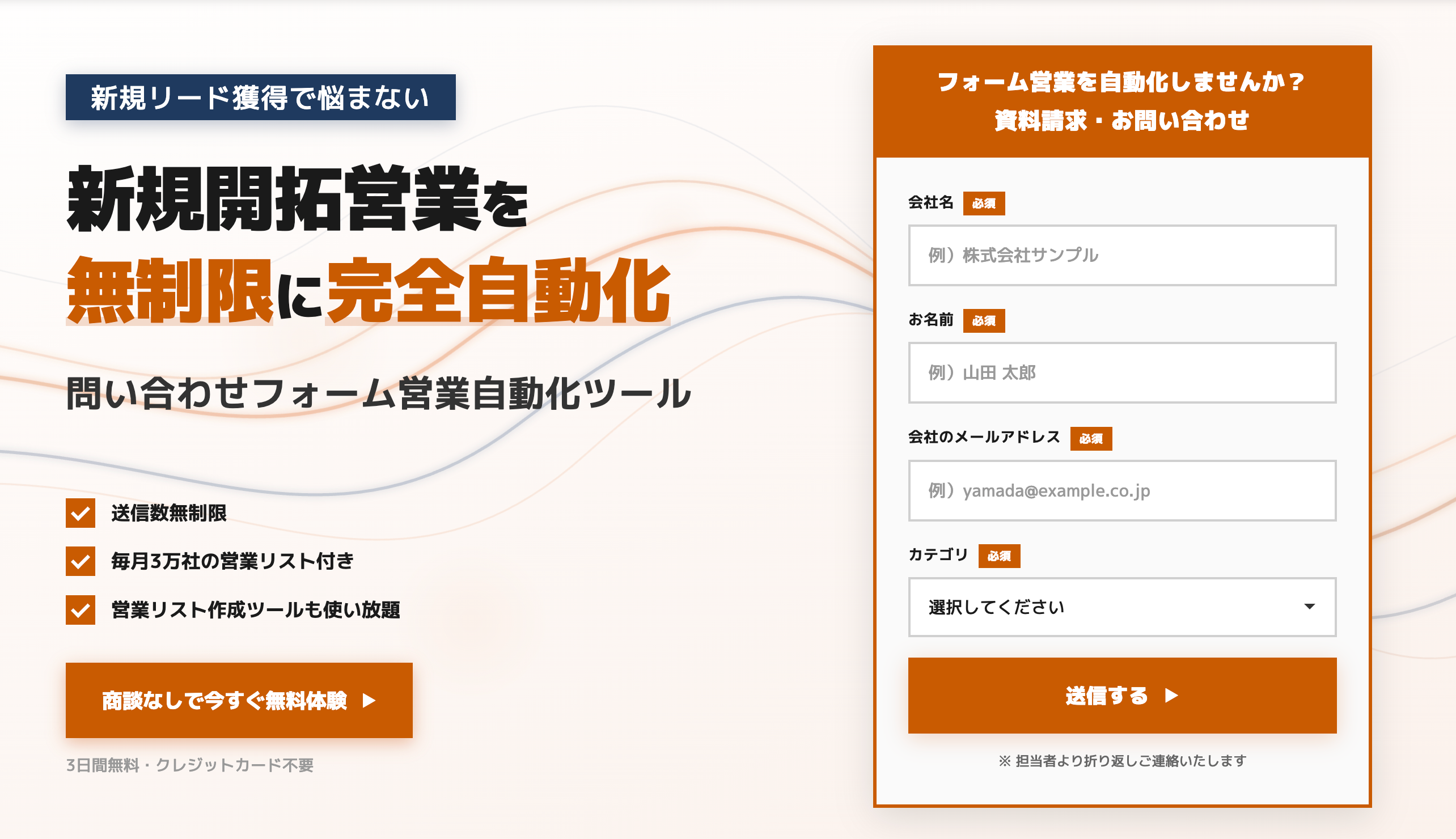 毎月3万社の営業リスト付き・営業リスト作成ツールも無制限。月額4.5万円から、初期費用0円・3日間の無料体験が可能