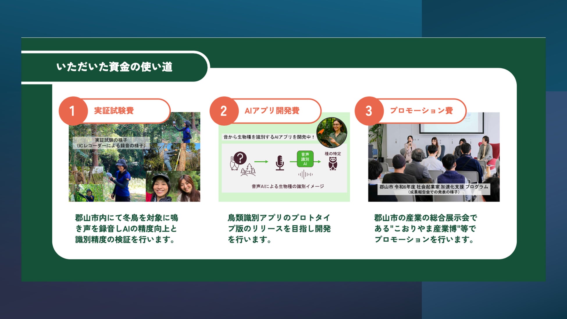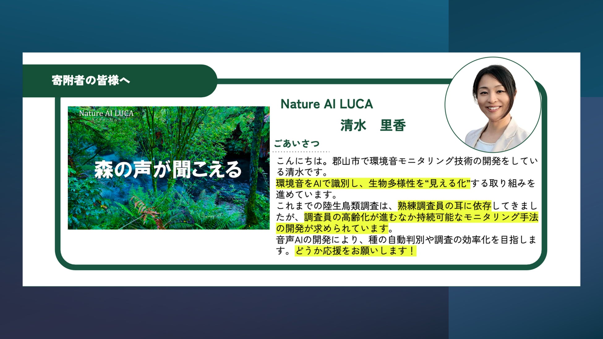 本プロジェクトは、郡山市が実施している ふるさと納税型ガバメントクラウドファンディングを活用した取り組みであり、郡山市社会起業家加速化支援プログラムに採択され、「Nature AI LUCA」の名称で活動する社会起業家・清水里香が、音声AIによる環境モニタリング技術の開発を進めているものです。