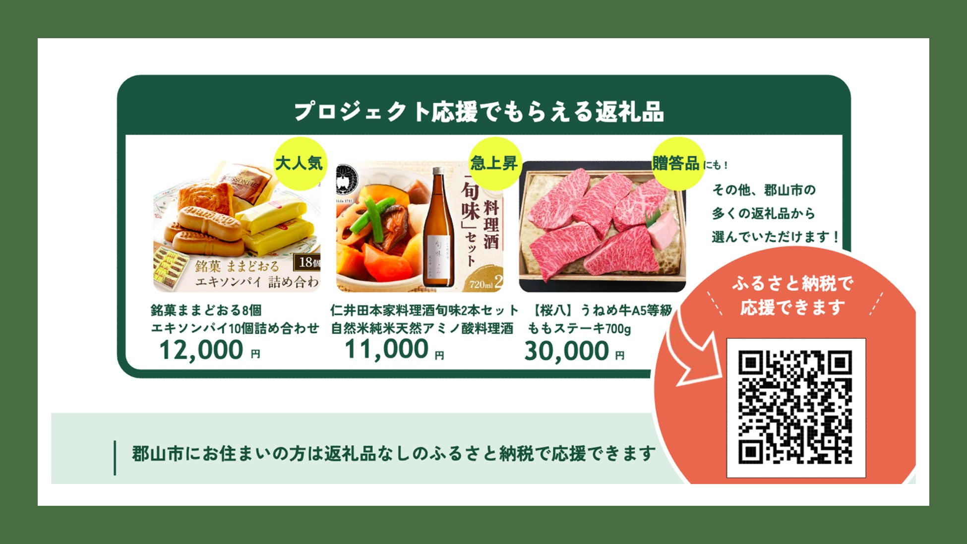 現在、この活動を応援できる 返礼品付きのふるさと納税(ガバメントクラウドファンディング) が公開されており、個人の方も利用可能です。