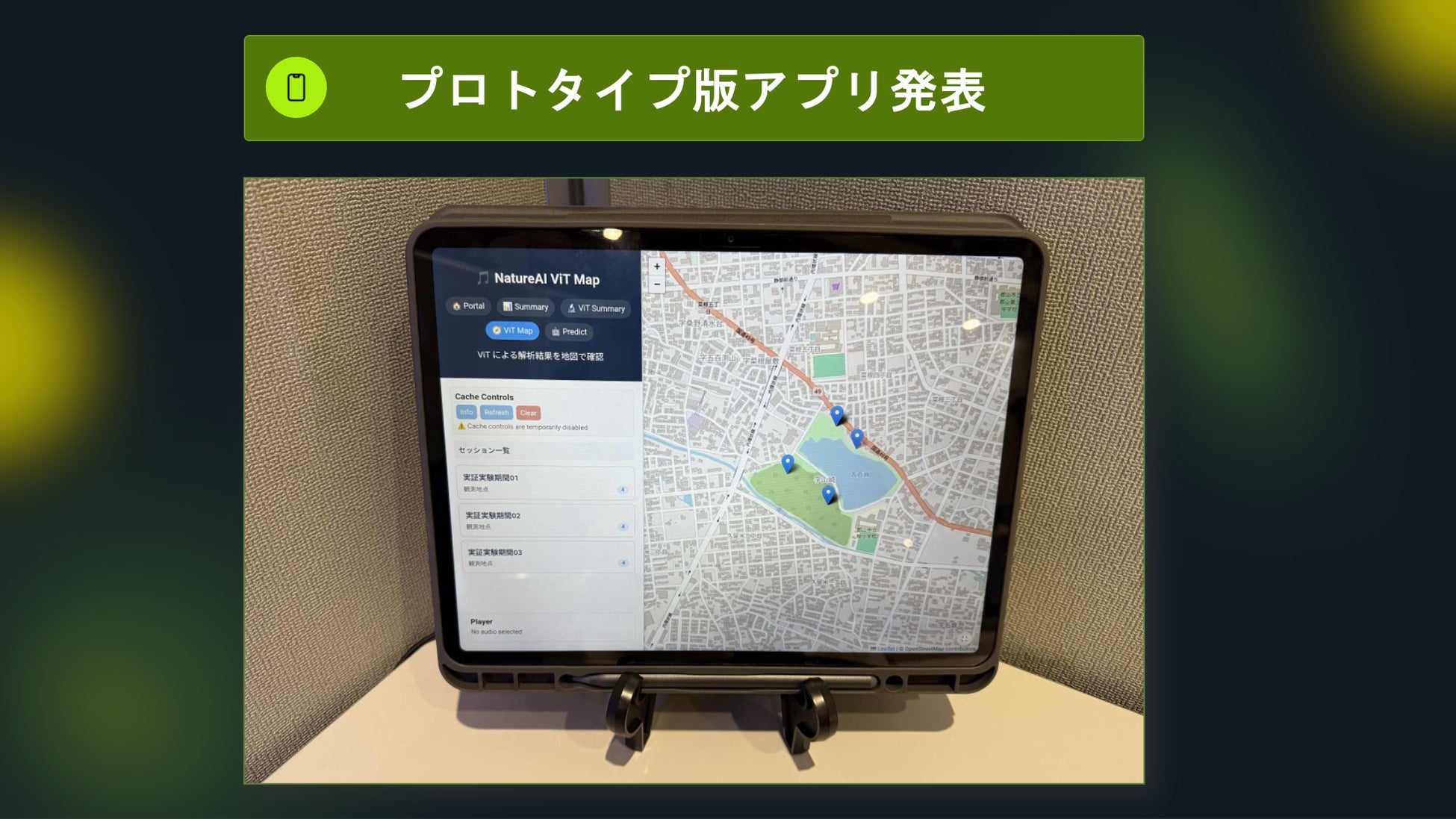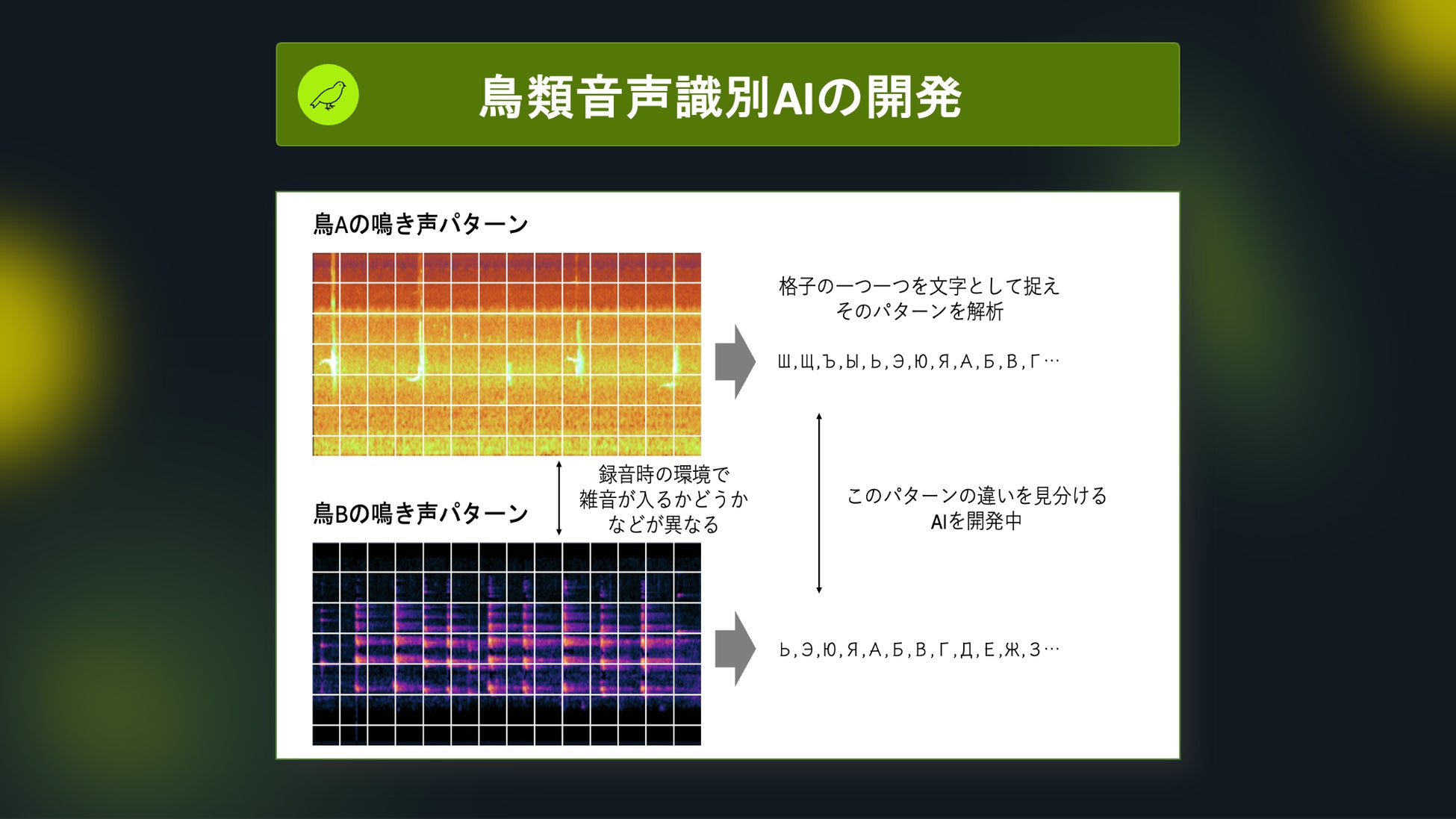 鳥類の鳴き声など自然音を自動解析し、生態の変化を“音”から可視化することを目指す取り組みです。