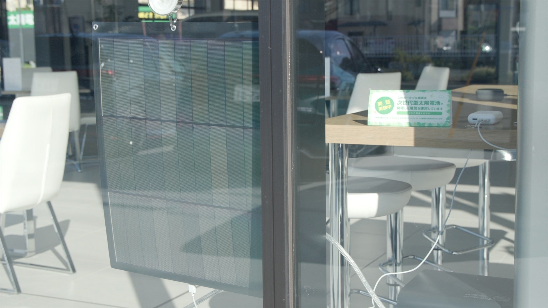 私たちが手掛けるカルコパイライト太陽電池は「薄く、軽く、曲げられる」ことに加え、金属と石の材料で形成されているため熱に強く、またつなげて自由な大きさで使用できるのが特徴です。今回の日産店舗では、1メートル以上の横長形状のものを店舗の窓に設置したほか、柱に巻きつける形でも設置しました。