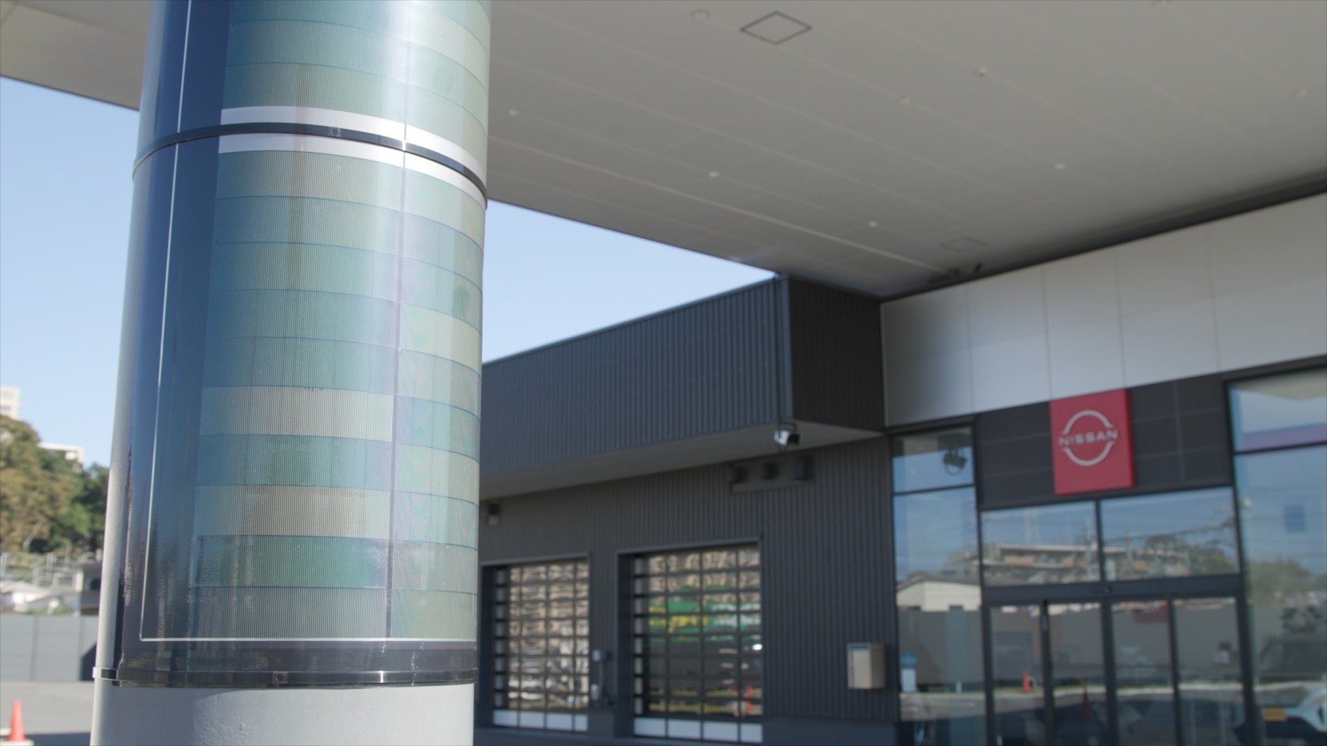 日産自動車株式会社(社長:イヴァン・エスピノーサ、以下「日産自動車」)は、神奈川県が実施する「次世代型太陽電池普及促進事業」(※1)の採択を受けて進めていた事業について、日産神奈川販売株式会社のR1東戸塚店(横浜市戸塚区)に自動車販売店として国内初となる次世代型の「カルコパイライト太陽電池」の実証実験を10月16日(木)より開始しました。株式会社PXP(神奈川県相模原市)が開発・提供する「薄く、軽く、曲げられる」という特性をもつ「カルコパイライト太陽電池」を店舗ガラス面やキャノピー(※2)の円柱部分などに設置し、「見える再生可能エネルギー(再エネ)店舗」として来店者が発電電力を体感できる環境を整えています。