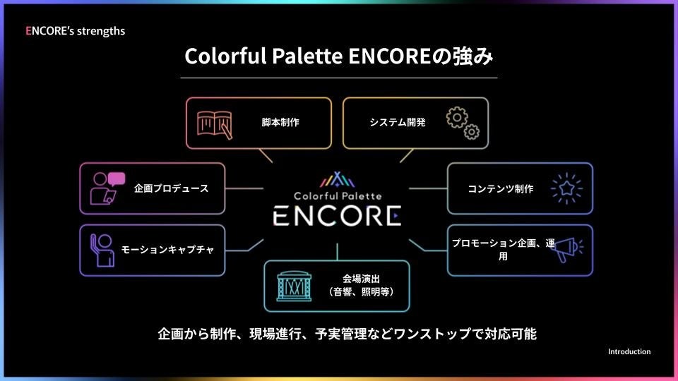 ライブ特化型の描画を実現する「Deep-Enhanced-Creative-Output-Engine(通称:DECO-Engine)」など独自技術のほか、妥協せず体験を追求する企画力とクオリティコントロールで、「人生最高の一日」をワンストップで作り出します。
