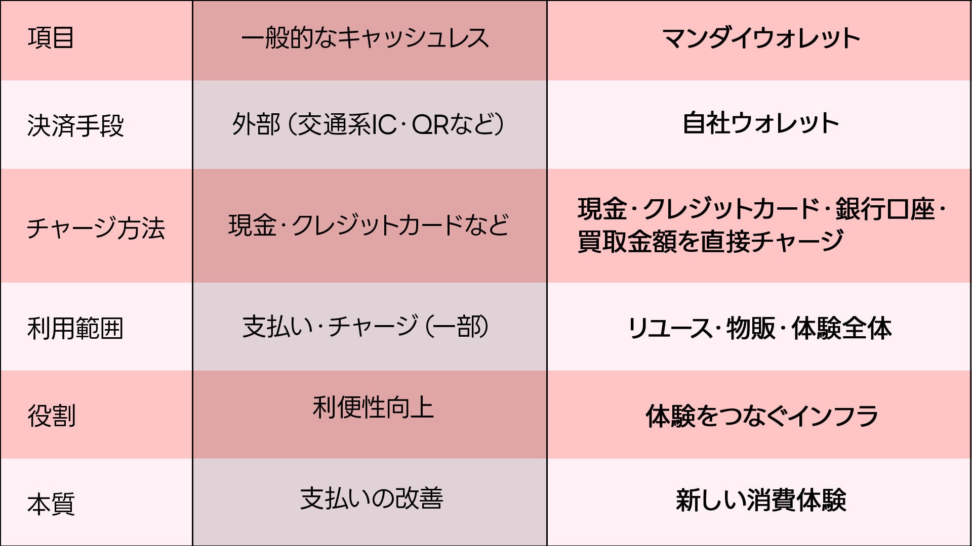一般的なクレジットカードやキャッシュレス決済は、主に「支払いを便利にする」ための手段です。一方で「マンダイウォレット」は、買取金額を起点に、遊びと買い物まで店内で完結させる仕組みとして設計されています。