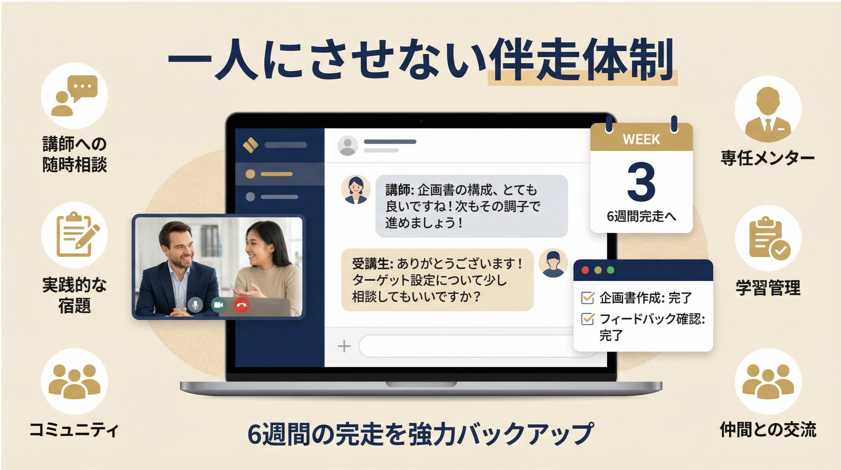 受講期間中の6週間、以下のサポート体制により着実なアウトプットを促進します。