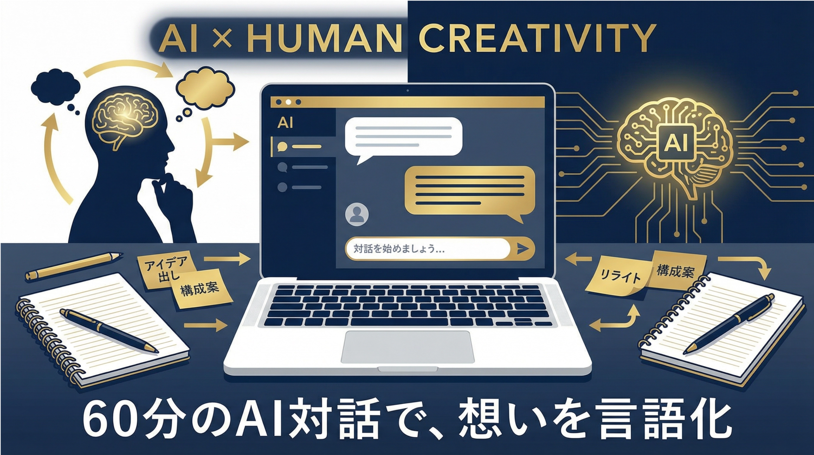 「書きたい想いはあるのに、形にできない」という出版のボトルネックを解消するため、私たちは最新のAI対話を用いた独自の執筆プロセスを開発しました。これは単なる効率化ではなく、「自分一人では到達できない深さまで想いを掘り起こす」ためのクリエイティブな対話です。
