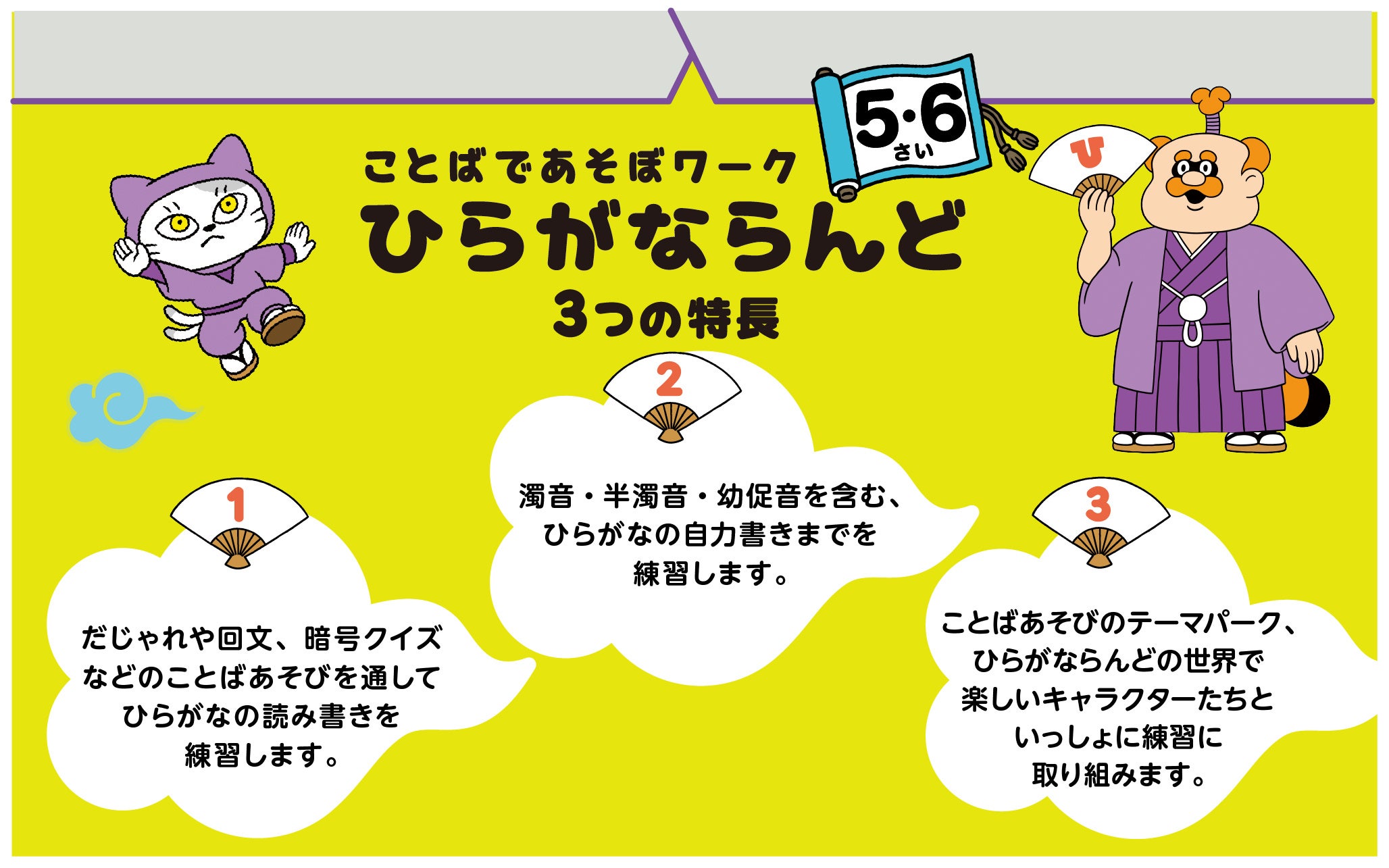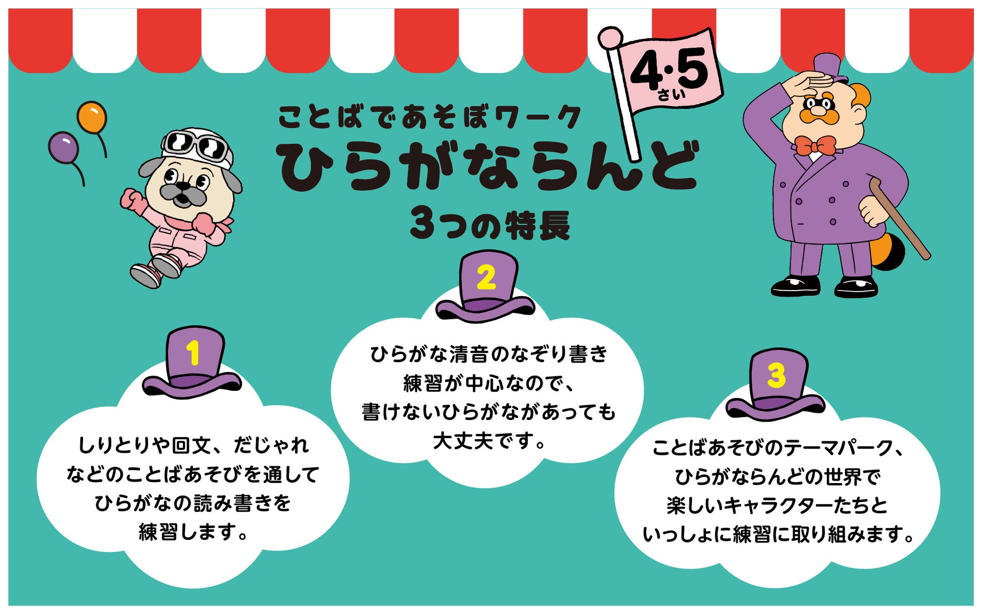 「言葉の楽しさに触れながら、最後まで楽しく続けられるワークがほしい」という声から生まれたシリーズ『ことばであそぼワーク ひらがならんど』は、ひらがなの読み書きを始めたお子さまが、言葉の楽しさに触れながらひらがなを学べるワークブックです。