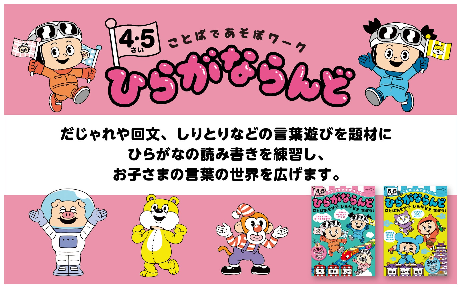 株式会社くもん出版(代表取締役社長:泉田 義則)は、楽しいキャラクターと一緒にひらがなの練習に取り組めるワークブック『ことばであそぼワーク ひらがならんど』4・5さい向け、5・6さい向け、計2点を刊行しました。