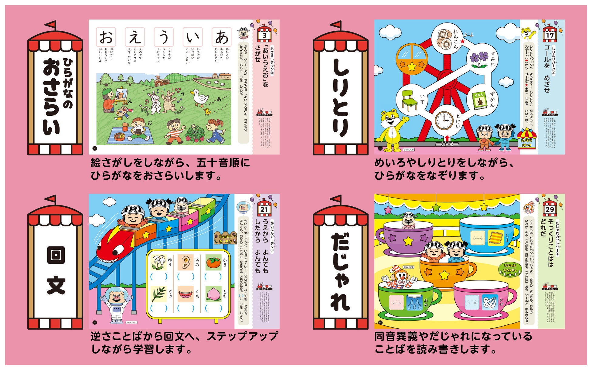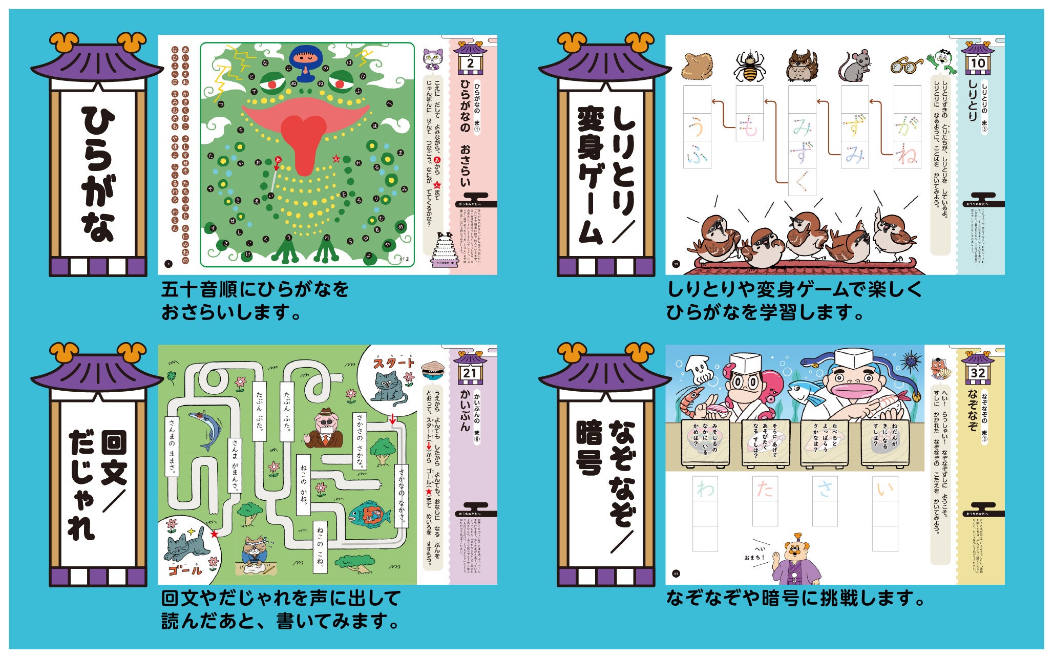 だじゃれや回文、しりとり、言葉のクイズなどの楽しい言葉遊びを通して、ひらがなの読み書きを定着できるワークブックです。多彩なアプローチで、お子さまの言葉や文字への興味を育みます。