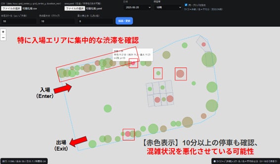 停車状況の可視化:夕方以降は停車可能場所が34~55%占有されている可能性を確認、また西口暫定ロータリーを覆うほどの滞留を簡易ダッシュボードで可視化した。